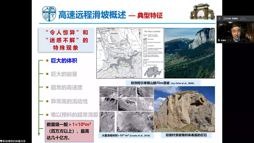 本次讲座介绍了两大部分,第一部分是高速远程滑坡动力学研究新进展汇报。在这部分,程教授首先对高速远程滑坡进行概述,其有速度高、动能大、流体化强烈、危害巨大、难以防空等特点;接着是对国内外的研究情况进行了简单的介绍。