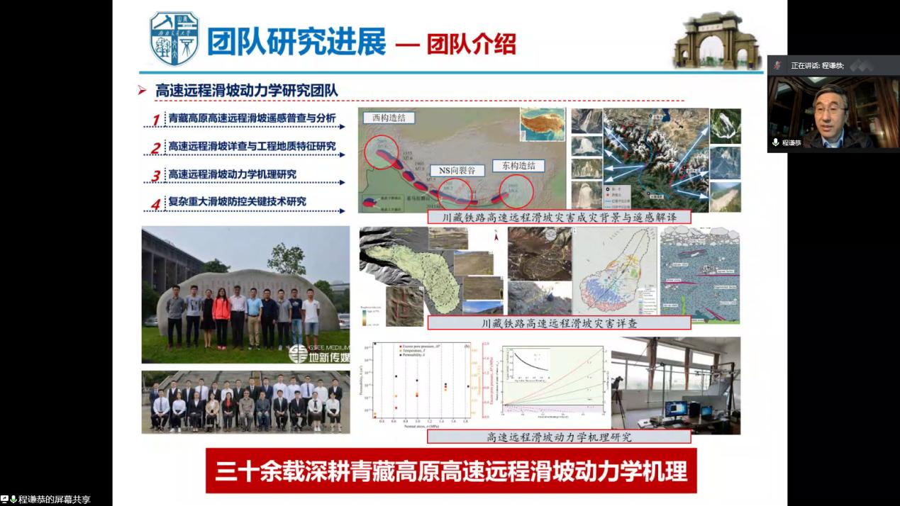 其次,程教授介绍了青藏高原地质灾害特征,对川藏铁路沿线的地质问题进行了一定的讲解、拓展。最后,程教授向同学们介绍了自己的团队研究进展,主要有以下四个方面:1.青藏高原高速远程滑坡摇感普查与分析;2.高速远程滑坡详查与工程地质特性研究;3.高速远程滑坡动力学机理研究;4.复杂重大滑坡关键技术研究。