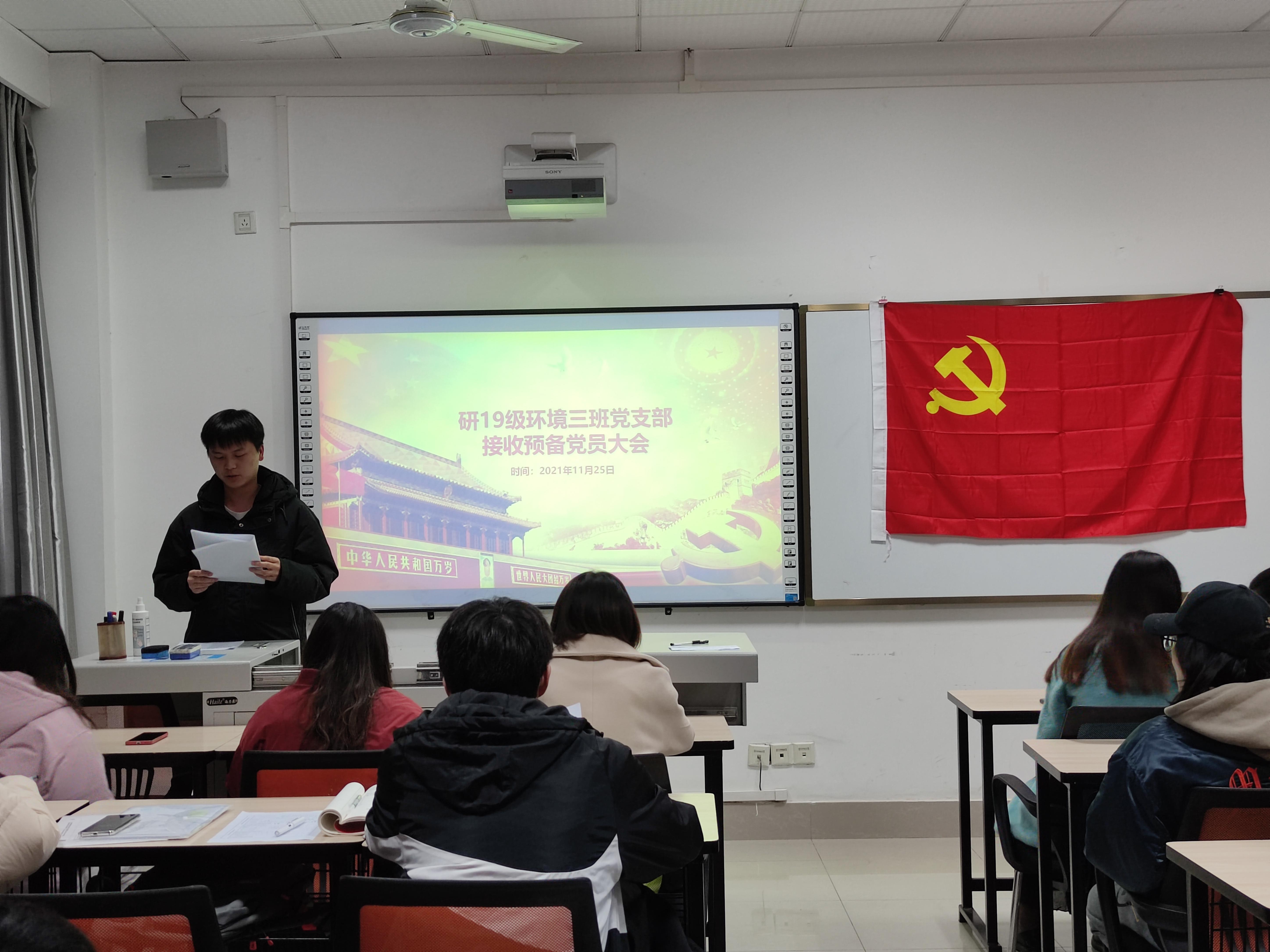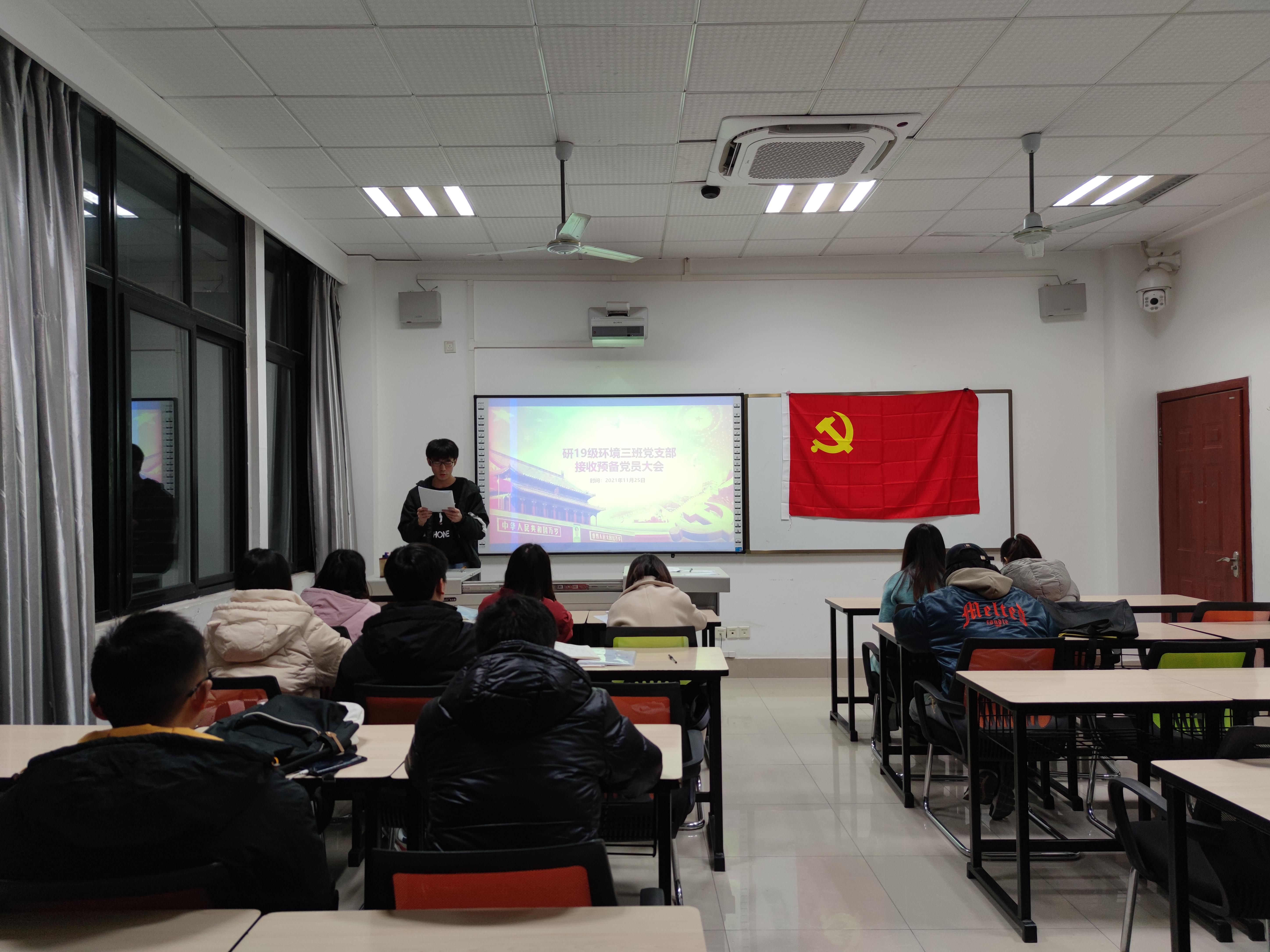 犀浦校区X4129教室顺利开展了预备党员接收大会。研19级环境三班党支部会议主要讨论了关于许志杰、刘雨和王贤坤同志申请转为预备党员的问题。会议由党支部书记白慧主持,全体党支部成员出席了此次会议。