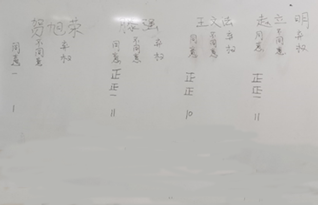 四名积极分子答辩结束后,与会党员进行不记名投票表决,由李智、陈志辉两位同志负责统计11名党员的表决情况。最终支部委员会结合座谈会、答辩大会以及入党积极分子的现实表现情况综合讨论,确定滕强、赵立明同志为支部本期的发展对象人选。