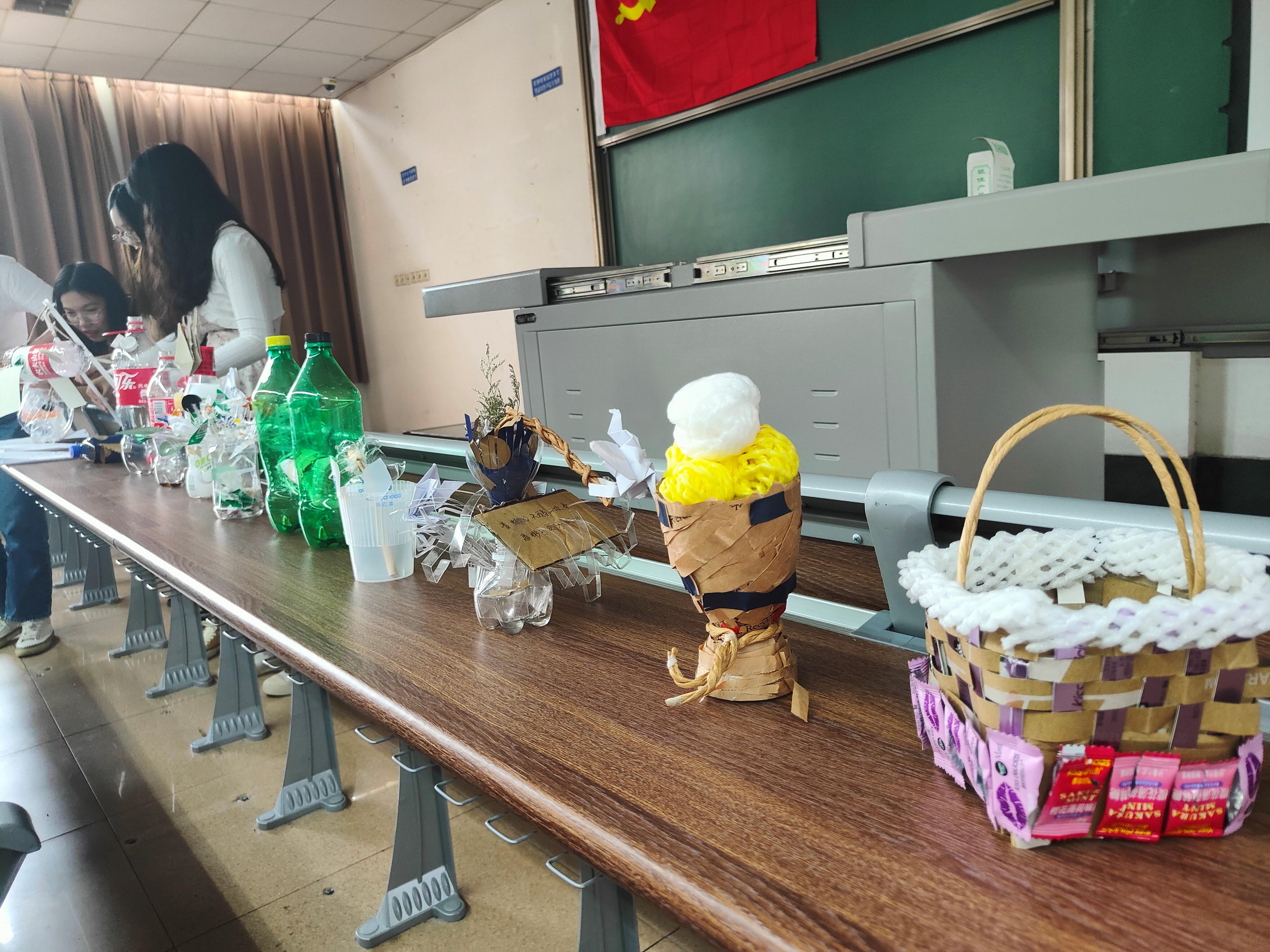 本次活动设置了塑料回收站、重“塑”实验室、环保“袋”言人、拒绝塑料情四个环节。第一个环节塑料回收站,参与的同学们通过清理校园内外街道的塑料垃圾、收集平时生活中的塑料废物兑换环保手工袋,强化了同学们的减“塑”意识,倡导同学们在生活中拒绝使用一次性塑料袋,多用环保手袋;