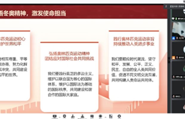 黄光林同志从北京冬奥会概况、冬奥会特色亮点、冬奥会中国代表团冠军介绍三个方面对2022年北京冬奥会进行了详细介绍。其中,中国代表团取得了自1980年参加冬奥会以来的历史最好成绩。本次冬奥会在赛事组织、赛会服务、指挥调度等工作方面树立了奥运新标杆,绿色、低碳、安保等方面均体现了本次冬奥满满的科技感。此外,在疫情影响下,本次冬奥会有效保障了参赛及相关人员的健康安全,向全世界展现了人类战胜困难和挑战的强大力量,成为疫情下首次如期举办的全球综合性体育盛会,也为今后举办国际性重大活动提供了成功范式。最后黄光林同志带领大家一起感悟了冬奥精神:厚积薄发的积淀精神、不具挑战的拼搏精神、美美与共的和谐精神。我们要牢记奥林匹克运动初心,共同维护世界和平;我们要弘扬奥林匹克运动精神,团结应对国际社会共同挑战;我们要践行奥林匹克运动宗旨,持续推动人类进步事业。