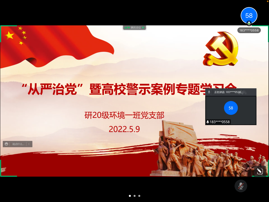 2022年5月9日星期一晚上九点,研20级环境一班党支部于腾讯会议召开“从严治党”暨高校警示案例专题学习会,主要内容为:深入学习王顺洪书记在每日大赛