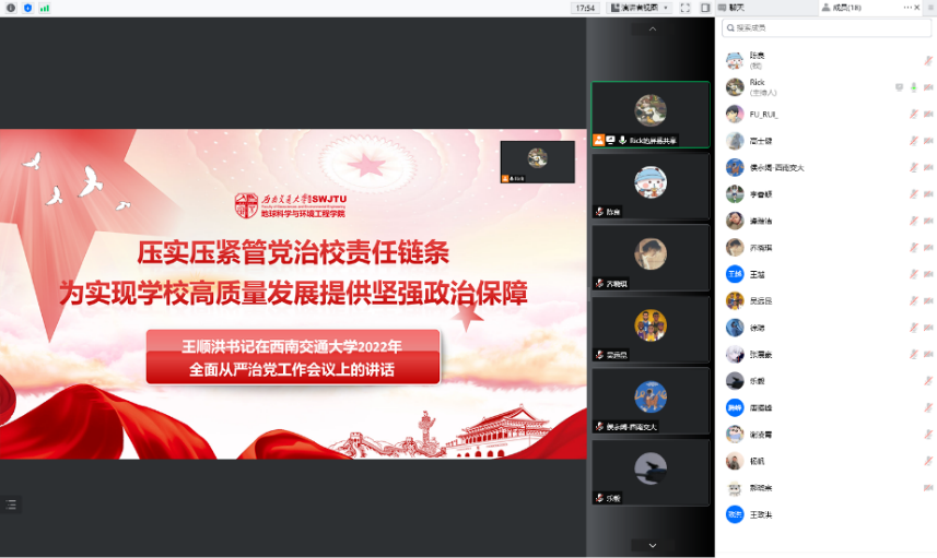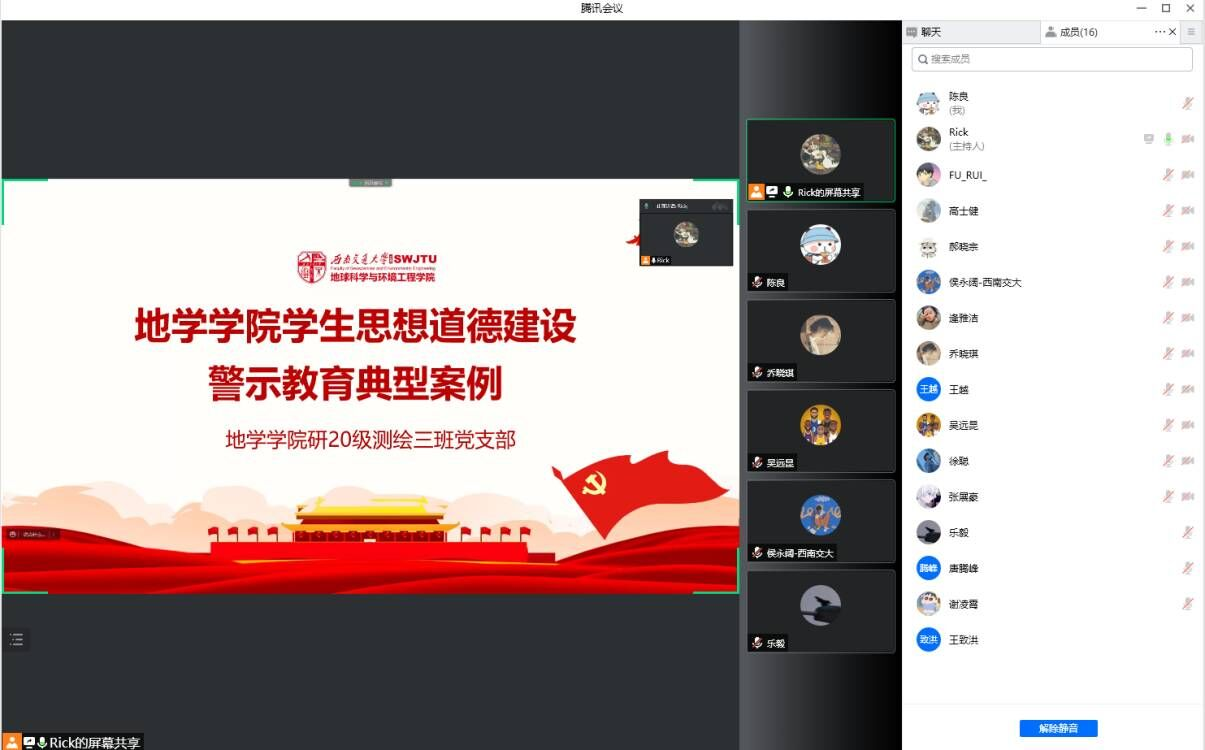为全面贯彻党的十九届六中全会、十九届中央纪委六次全会精神,认真贯彻学校党委关于全面从严治党有关要求,进一步加强党的纪律建设,同时为进一步加强高校学生校规校纪教育,发挥违纪案例对其他学生的警示教育震慑作用,尤其充分利用学生党支部及学生党员的战斗堡垒和先锋模范作用,不断强化学生纪律观念,远离违纪红线,利用身边案例警示教育身边人,2022年5月8日,研20级测绘三班党支部于线上开展“从严治党”暨高校警示案例专题学习会,会议由党支部书记高颖同志主持。