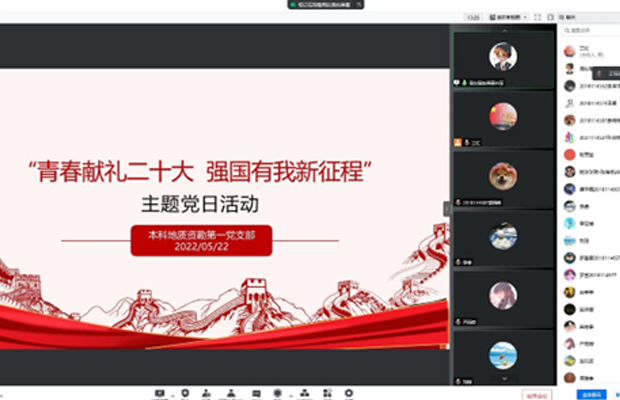 2022522日晚7点,本科地质资勘第一党支部于腾讯会议开展了青春献礼二十大,强国有我新征程主题党日活动。本次活动由组织委员周仪雯同志主持,共28名党员参与。