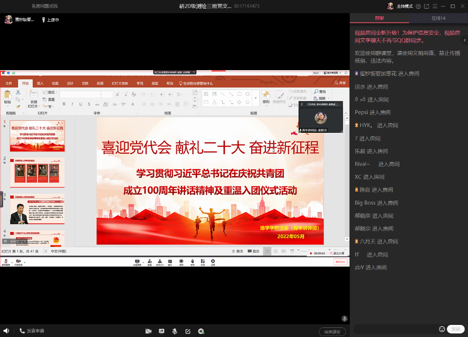 4月25日,在五四青年节即将到来之际,中共中央总书记、国家主席、中央军委主席习近平到中国人民大学考察调研,与师生代表面对面交流谈心,并发表了重要讲话。5月10日,习近平总书记出席庆祝中国共产主义青年团成立100周年大会,并发表了重要讲话。在学院党委的指示下,2022年5月24日晚八点,研20级测绘三班党支部于线上开展了相关学习活动。本次学习活动由支部逄雅洁同志领学。