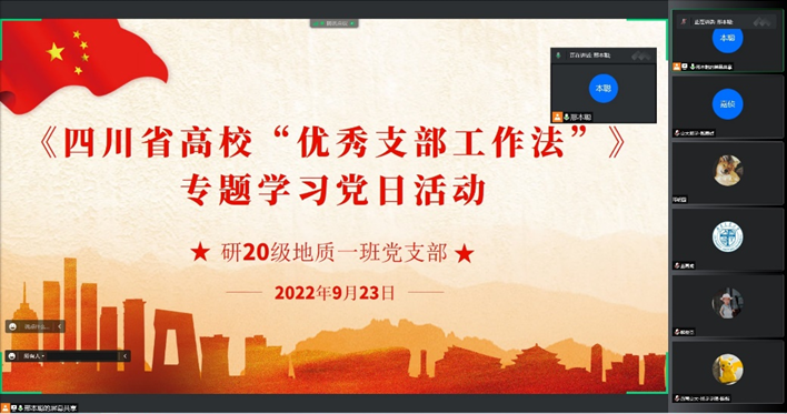为不断提升川内高校党建工作质量,以实际行动迎接党的二十大胜利召开,省委教育工委自2021年9月启动了川内高校“党建工作品牌”、“优秀支部工作法”评选活动,并于2022年6月举行了发布推广会。为深化支部成员对高校党建工作的认识和理解,帮助支部建设拓宽思路,研20级地质一班党支部于2022年9月23日,开展了线上《四川省高校“优秀支部工作法”》专题学习党日活动,进一步学习川内高校优秀党支部工作范例。本次活动由党支书邢本聪同志主持,支部23名成员与会。