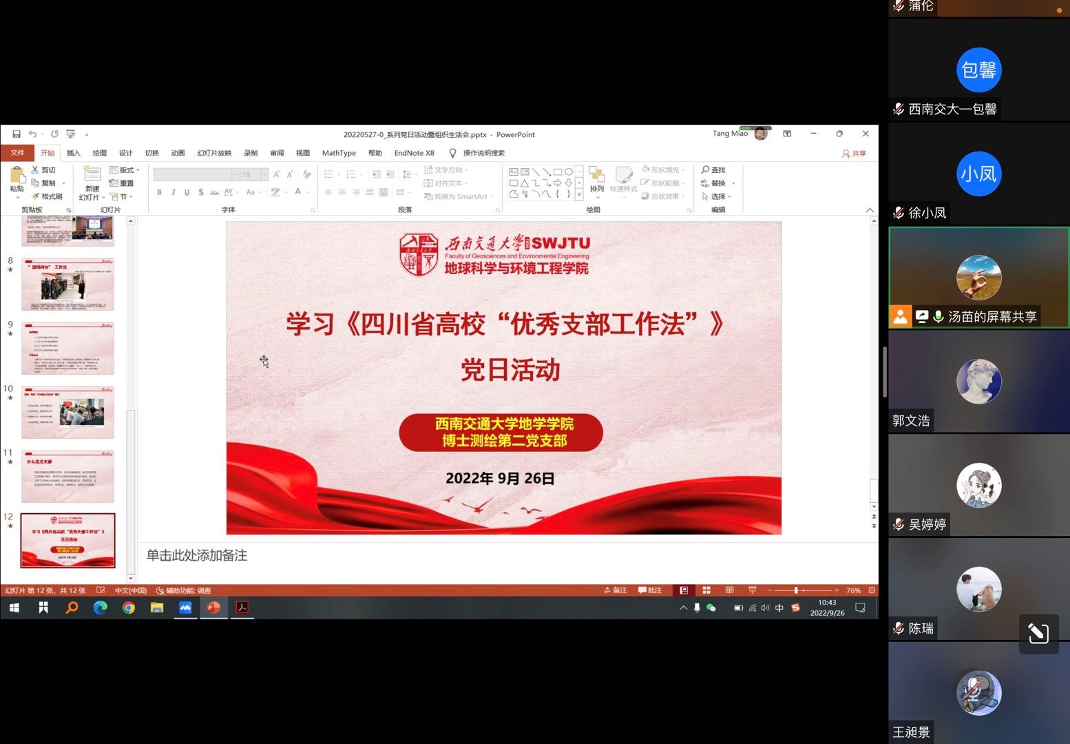 博士测绘第二党支部通过腾讯会议(会议ID:851 499 666)在线上开展了学习《四川省高校“优秀支部工作法”》专题党日活动。会议由支部书记汤苗主持,支部全体成员参加。