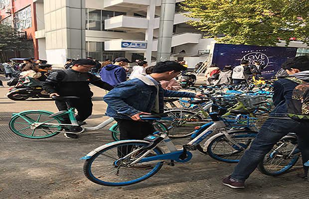 紧接着。我们进入本次活动的第二项即为师生做一件好事。这是我们党员的责任与义务。三个支部的同志一同到学校四食堂门口为同学们整理摆放好共享单车。为校园的整洁和同学们的便利奉献一份力量。