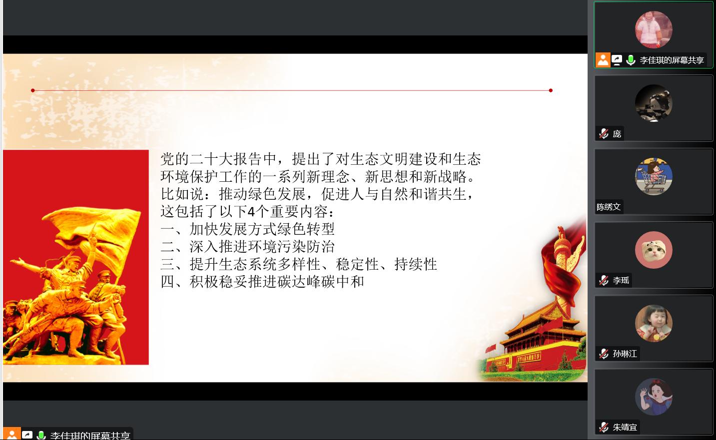 2022年10月28日星期五晚上八点,研20级环境一班党支部于腾讯会议开展“学习二十大精神·争做新时代先锋”主题党日活动,主要内容为:认真学习习近平总书记在中国共产党第二十次全国代表大会上的重要讲话精神。本次会议由研20级环境一班党支部书记李佳琪主持,研20级环境一班党支部全体党员参加。