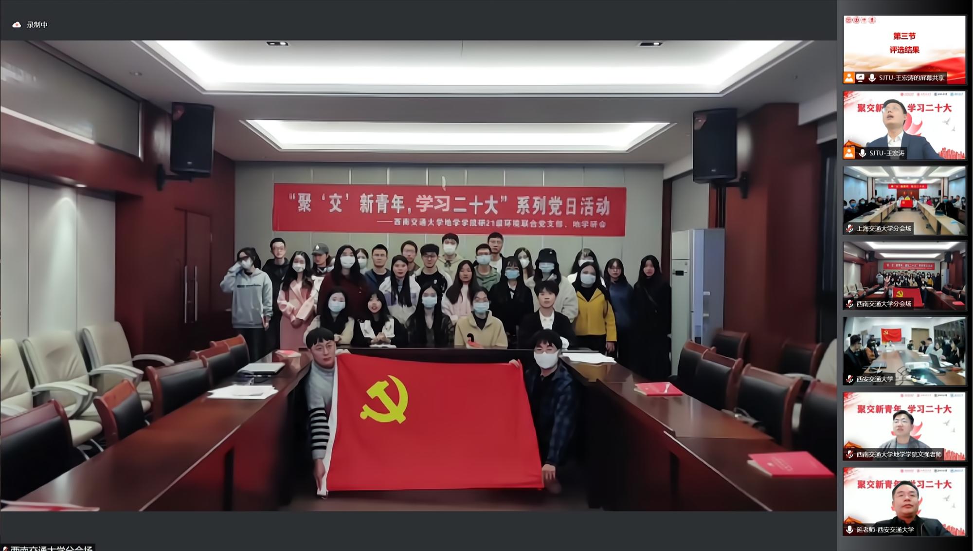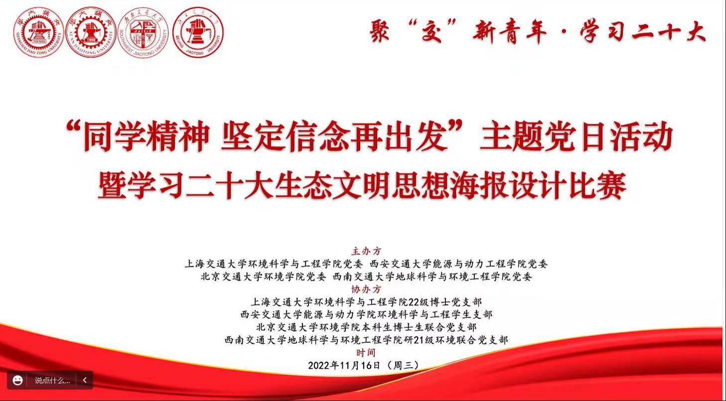 研21级环境联合党支部与上海交通大学环境科学与工程学院22级博士党支部、北京交通大学环境学院本科生博士生联合党支部、西安交通大学能源与动力工程学院环境科学与工程学生支部联合进行支部共建,四所交大青年学子汇聚云端开展【聚“交”新青年,学习二十大】主题党日活动。每日大赛