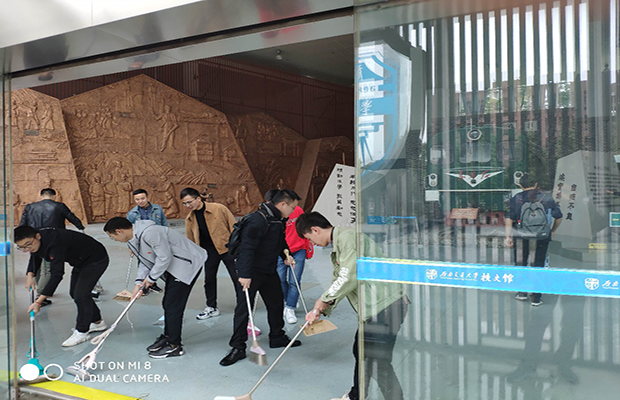 校史馆是学校的编年史,是陈列学校发展历史、展示学校办学过程和不同时代学校面貌的场馆;校史馆也是学校传统与校园文化集中表现的舞台,即以一定的平台和形式,将学校的优良传统与校园文化精粹充分展示的场所。当得知校史馆因下雨水管漏水,大门处易形成积水,并且不少展柜及展示品的死角处也积有不少灰尘之后,为了展示更好的校史馆馆风馆貌,联合党支部的全体党员自备清扫工具自发组织对校史馆进行了彻底的打扫。首先三位支部书记为大家做了具体分工,然后党员同志们有条不紊地在校史馆进行着义务劳动,最终使校史馆焕然一新。