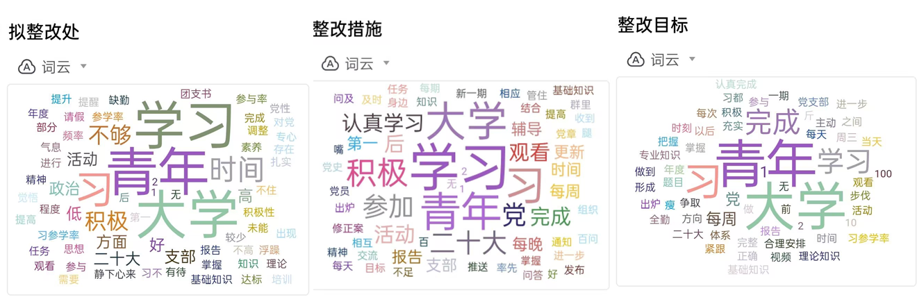 接着,由全体支部党员联系实际,开展严肃批评与自我批评,在这之前,通过线上形式收集了每位同志存在的问题、整改目标及周期,并生成词云图,更直观地看出问题共性。会上同志都坦诚、大方地指出对方的缺点、深挖自身的不足。通过这个环节,可以看出支部党员都存在的共性问题是,在思想政治理论学习上的积极性不强,但每位党员都深刻地认识到了自身的缺点,同时也提出了改正措施和周期,并作出承诺,在今后会定期自我反省,绝不再犯相同的错误。