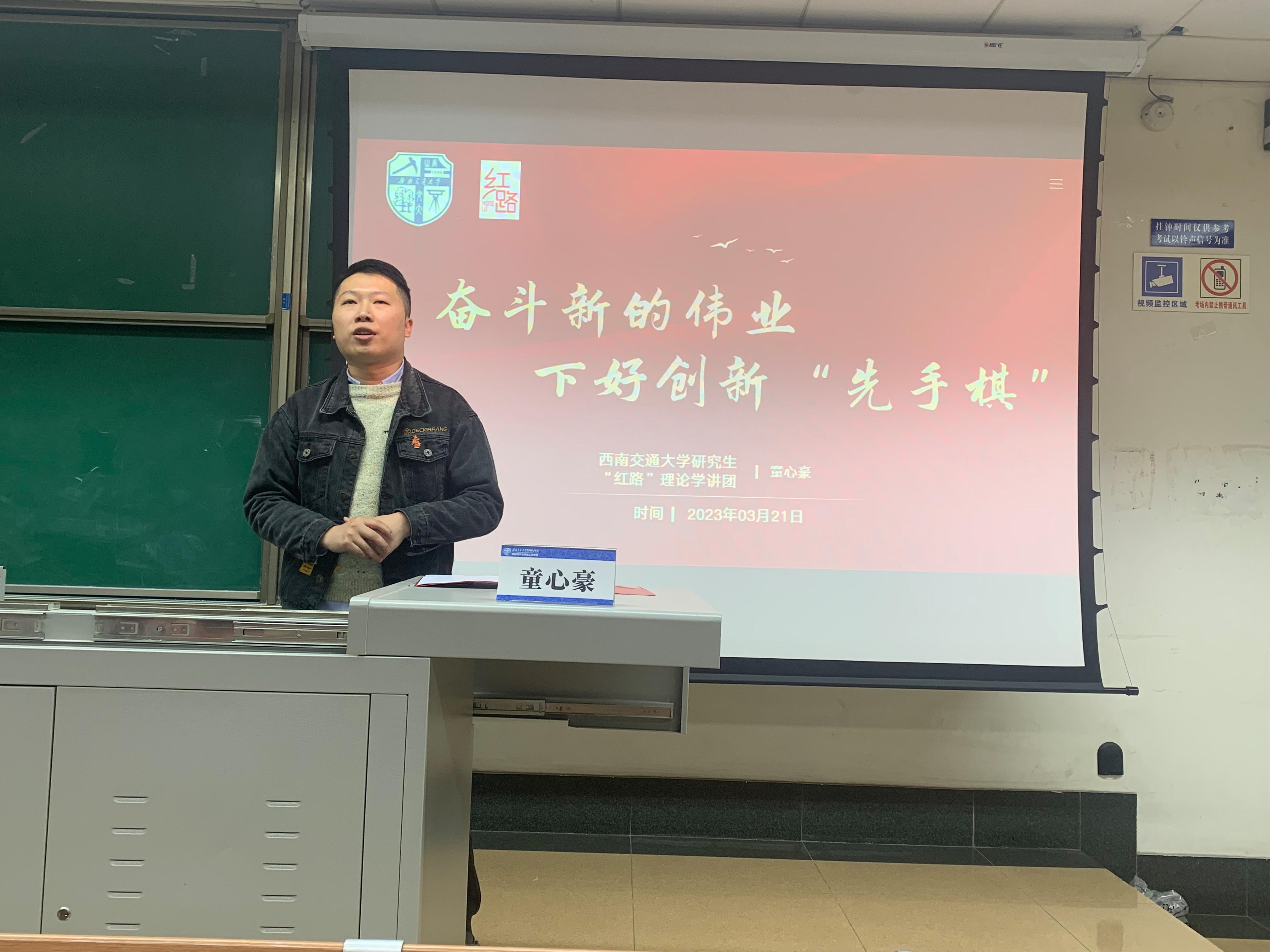 首先土木工程学院2020级博士研究生童心豪以《奋斗新的伟业,下好创新‘先手棋’》为题,进行了关于“实施科教兴国,强化现代化建设人才支撑”的学习分享。童心豪同志从道路、交通的变化作为开篇,结合自身科研经历,解读了党的二十大报告中科教兴国的含义。