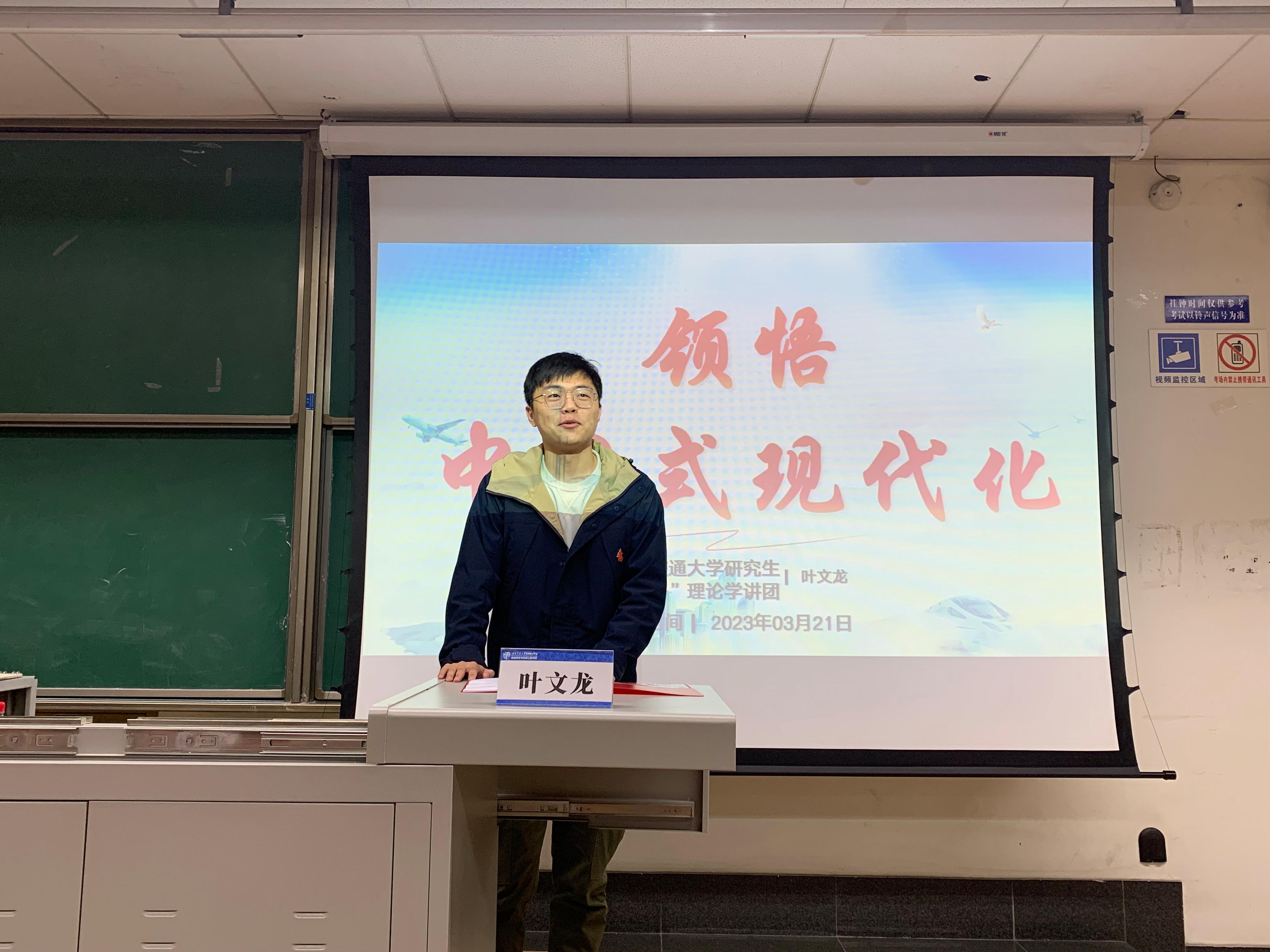 接下来,土木工程学院2021级博士研究生叶文龙以《领悟中国式现代化》为题系统的介绍了中国式现代化的含义以及特征,对中国式现代化是世界机遇进行了解读。