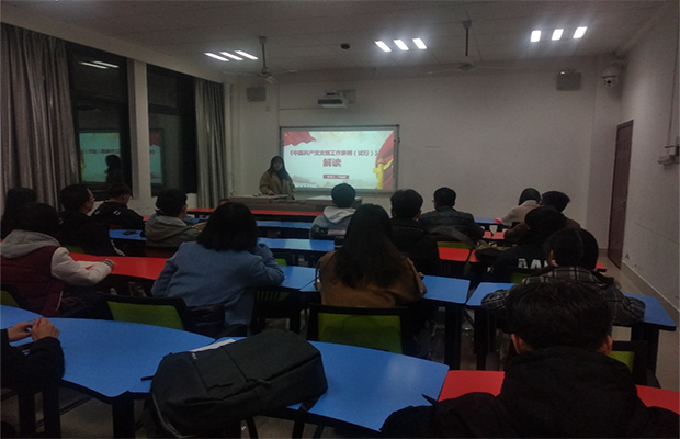最后,李国欣老师讲解了条例中强调的党支部工作必须遵循的五个原则、高校党支部工作总体要求、党支部基本任务、党支部组织生活要求,并要求学生党员应将先锋模范作用发挥充分,严格遵守党章与党纪党规,带头遵守国家法律和校纪校规,做遵纪守法的标杆。