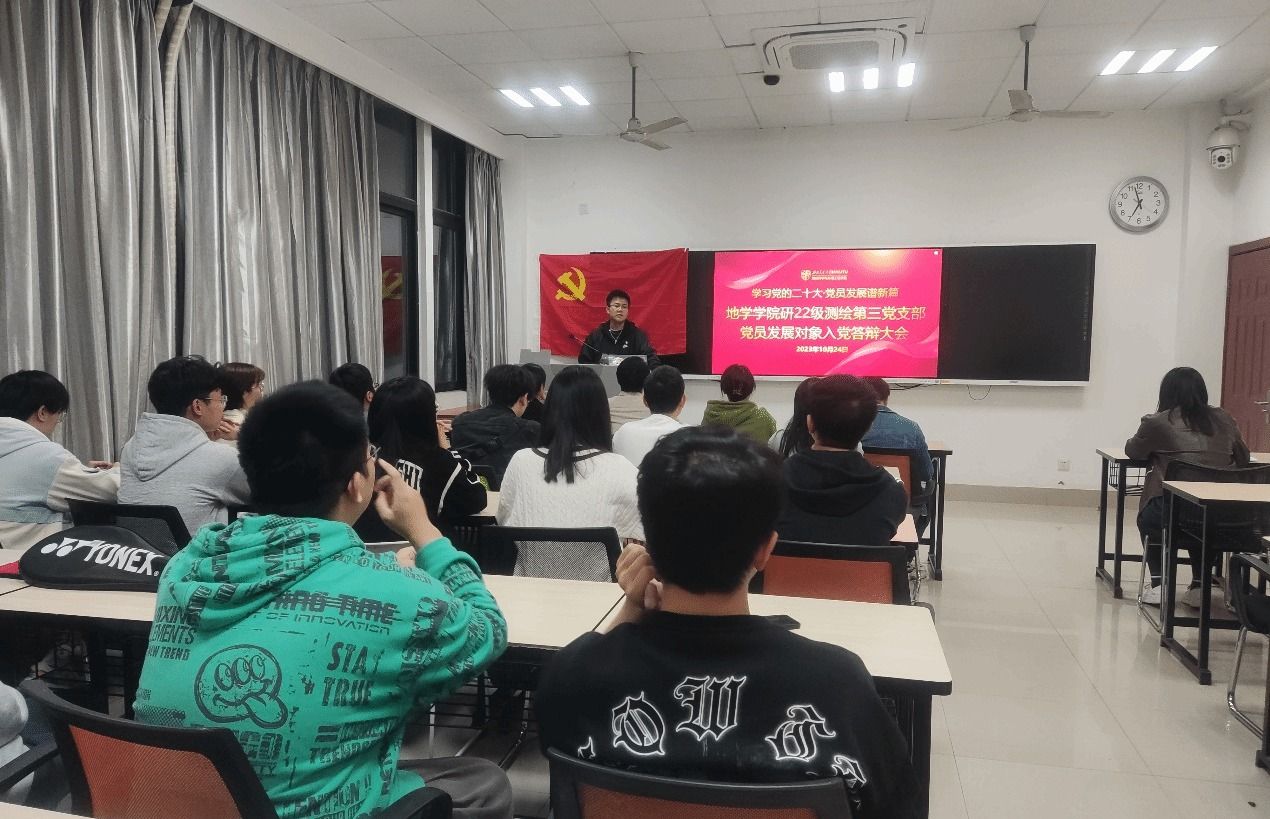 研22级测绘第三党支部在X4129教室顺利召开发展对象入党答辩会,会议的主题是从吴桐同志、李炎秋同志、陈星宇同志、黄涛同志、何轲同志这五位入党积极分子中选取一位作为2023-02期发展对象。本次会议16名党员(含1名预备党员)和所有入党积极分子均参加,此外,还特别邀请辅导员李林遥老师作为政治理论考核员,考察各位候选人的政治理论学习情况。会议由党支部书记刘翔同志主持。