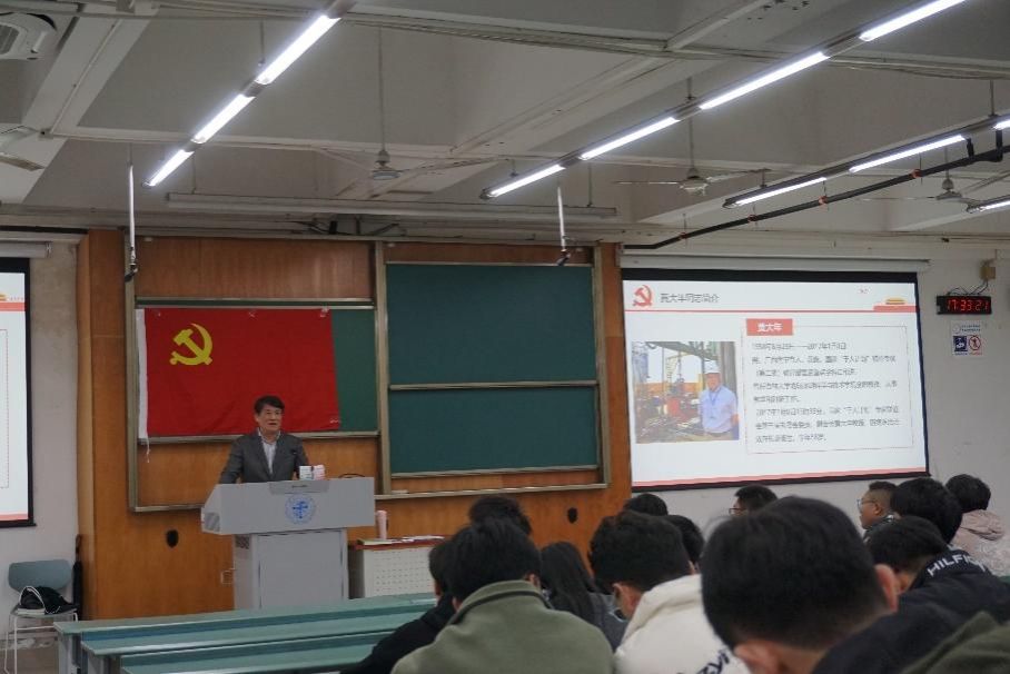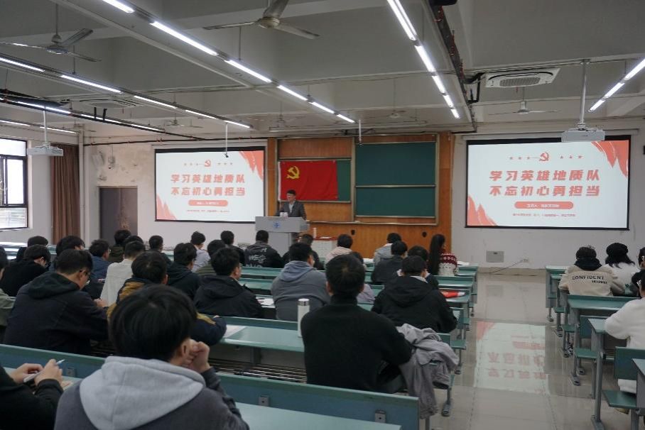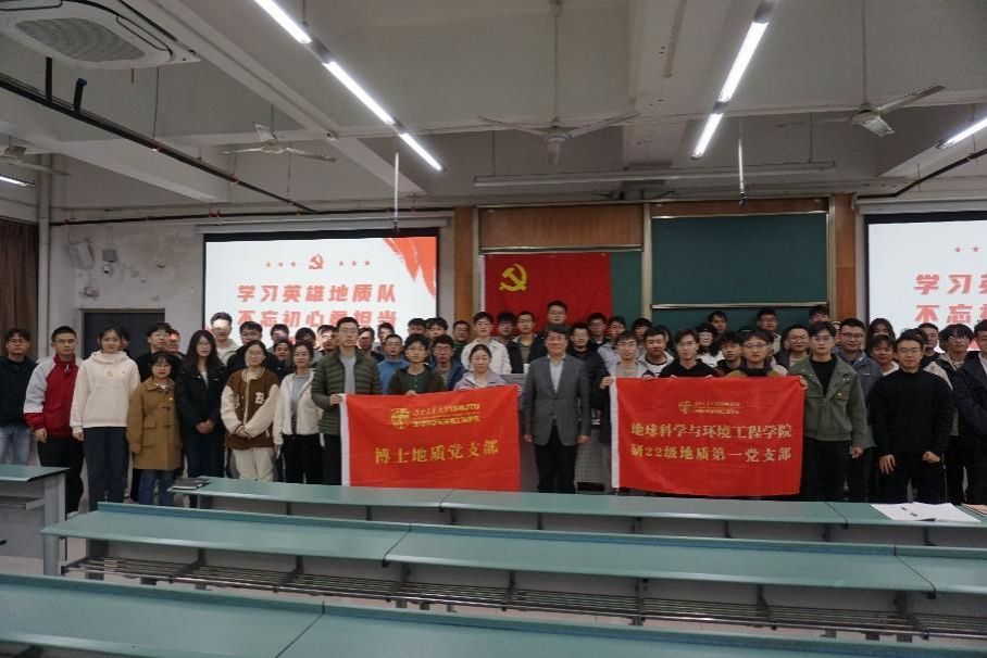 党委胡卸文教授在犀浦校区X4350教室为博士地质党支部、研22、23级地质第一、第二党支部的同学们讲授了一堂名为“学习英雄地质队,不忘初心勇担当”的专题党课。党课内容主要包括三部分:学习习近平给山东省地矿局第六地质大队全体地质工作者的回信精神,学习李四光精神,以及学习黄大年精神。