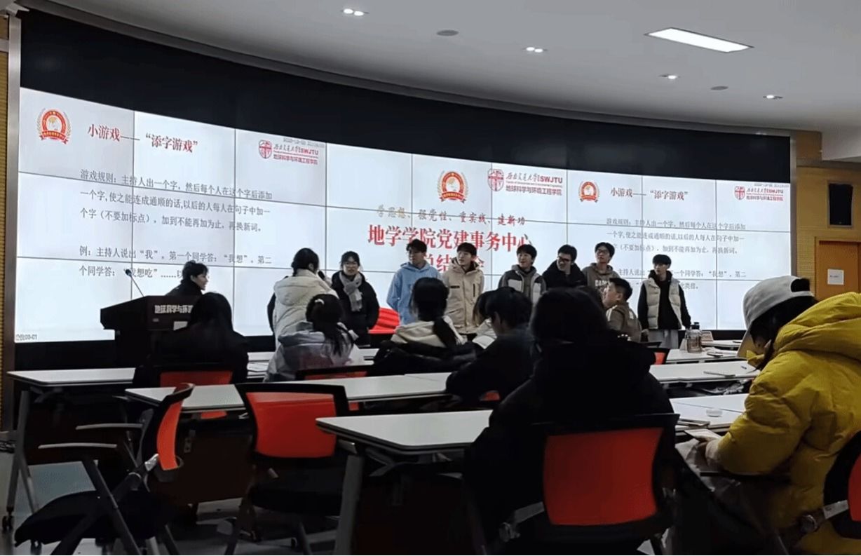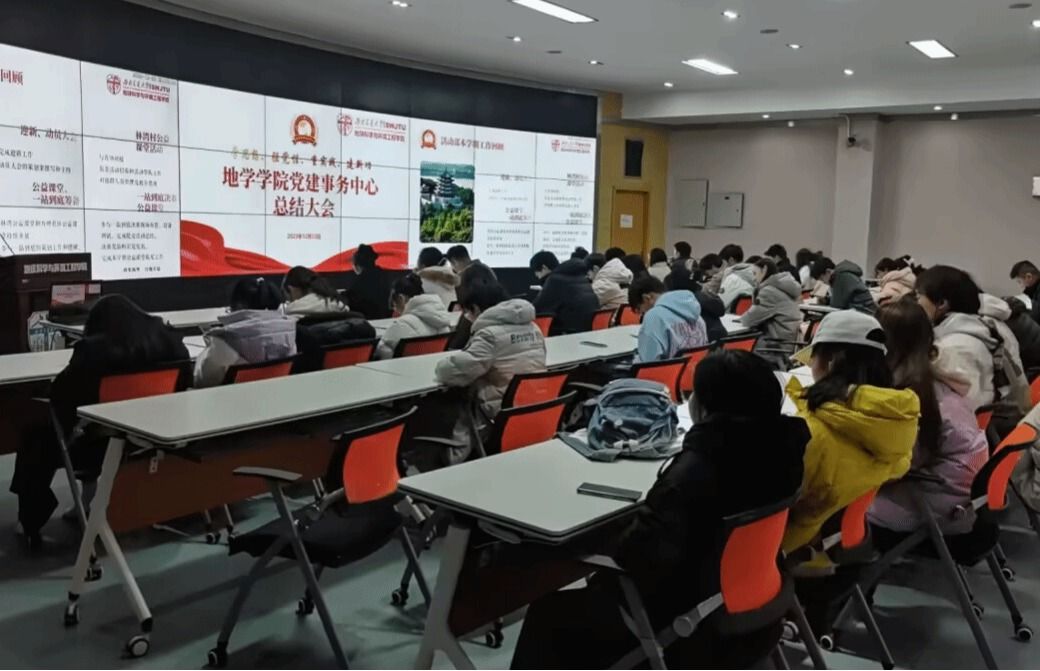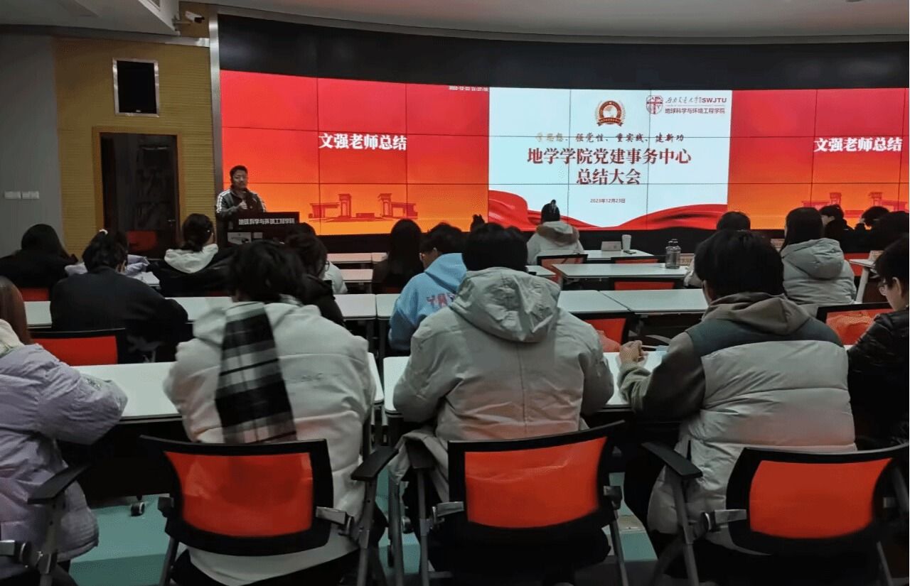 党建事务中心于2023年12月23日晚19:30在X4243会议室举行2023-2024学年第一学期总结大会。本次大会由活动部周妍利同学主持,学院团委书记杨都强、学生党建专项负责人文强、学生党建指导老师胡佳慧、郑非出席,党建事务中心全体成员参与。