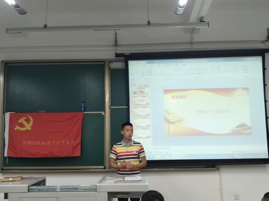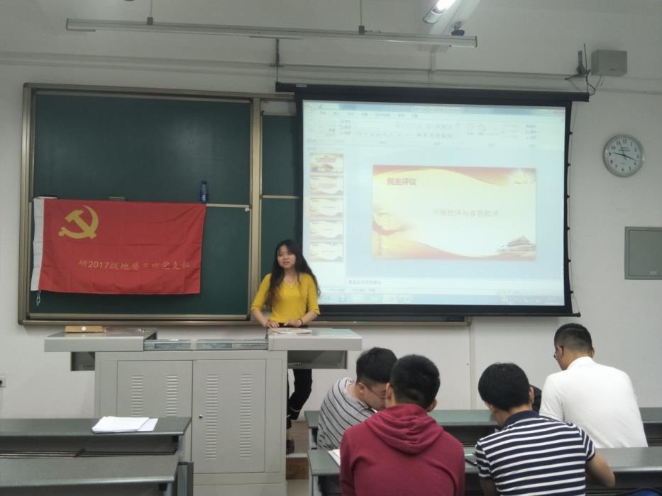 54日晚上,研17级地质三班党支部全体党员以及积极分子在X9201教室开展了民主评议。活动由党支部书记袁彬主持。