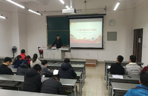 会议上,蒋星同志从习近平新时代中国特色社会主义思想、实现中华民族伟大复兴的中国梦、党是领导一切的等十个方面对十九大审议并通过的新党章作了全面阐释和说明。另外,喻崇湖同志从十九大会议、中国特色社会主义新时代、两个“奋斗十五年”以及十九大对青年一代的寄语四个方面深入浅出地对十九大精神作了解读,并引用一段话勉励大家:勇做时代的弄潮儿,在实现中国梦的生动实践中放飞青春梦想,在为人民利益的不懈奋斗中书写人生华章。