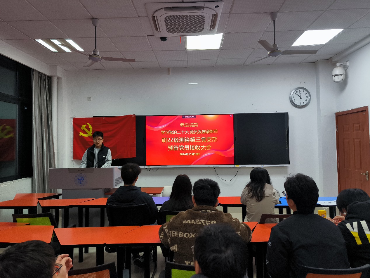研22级测绘第三党支部在X4132教室顺利召开预备党员接收大会,本次会议的主题:讨论是否接收刘苏凝同志为预备党员。会议由党支部书记刘翔同志主持,支部所有党员均参与。