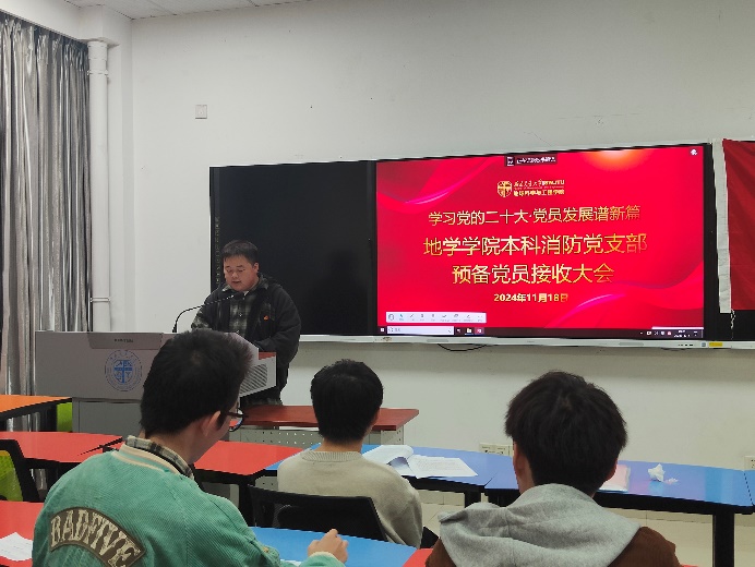 为了切实做好2024年发展党员工作,进一步提高党员队伍的素质与活力,提升党员发展质量,本科消防党支部于2024年11月14日在X4136教室举行了一次预备党员接收大会。此次大会的主要议题是讨论接收周爽、付君洋和李其钟三位同志为中共预备党员的相关事宜。