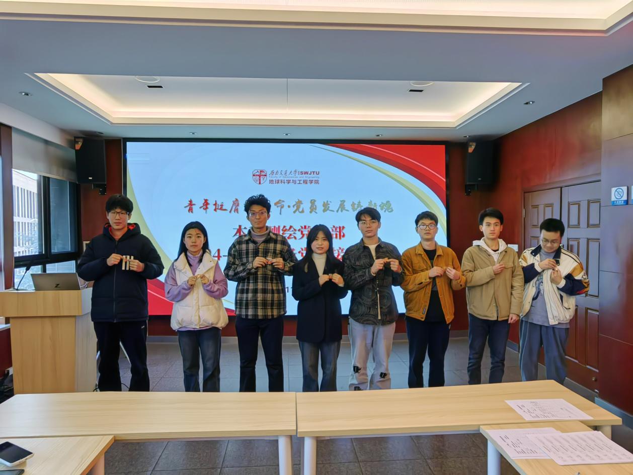 八名发展对象依次上台宣读入党志愿时,庄严宣读《入党誓词》,将自己的入党初心,现实表现讲述给党组织。后,由各位入党介绍人向党组织介绍发展对象在思想、学习、工作以及生活上情况。而后正式党员根据其入党志愿书内容并综合其发展对象期间情况进行投票。由本科测绘党支部组织委员付卢萱监票,宣传委员冯宇昊记票。综合投票结果,接收罗正午、窦润扬、穆欣宇、王鹏飞、王博、曹宸彰、周银、彭路鹏八位同志为中共预备党员。