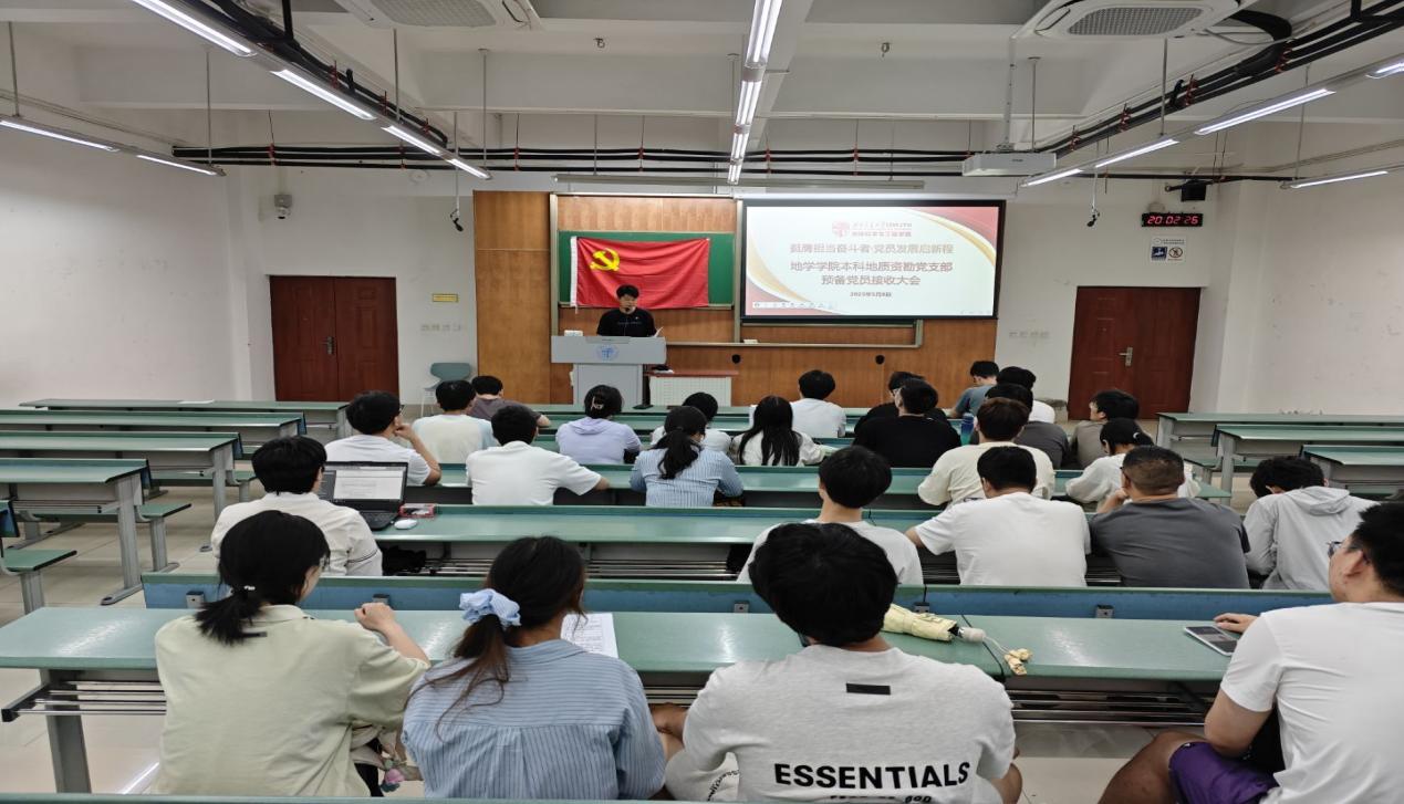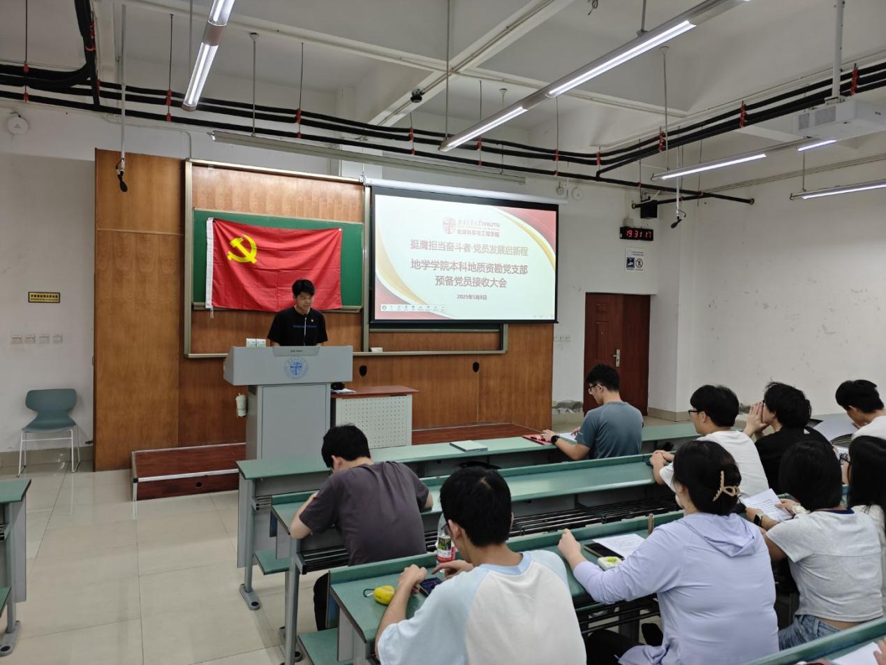 本科地质资勘党支部于2025年5月8日19:30在X4154召开2025-01期预备党员接收大会,审议、讨论、表决关于李美星等4名同志接收为中共预备党员的相关事宜。本次大会由本科地质资勘党支部书记廖望主持。
