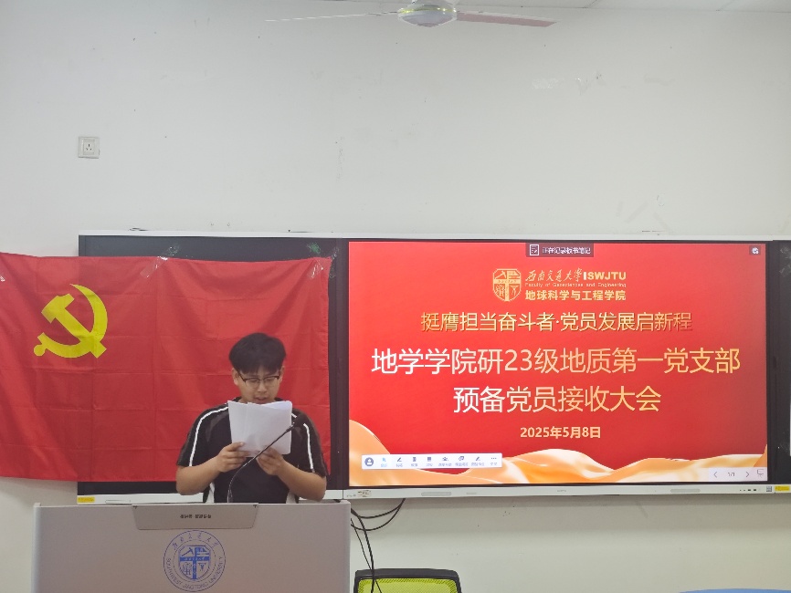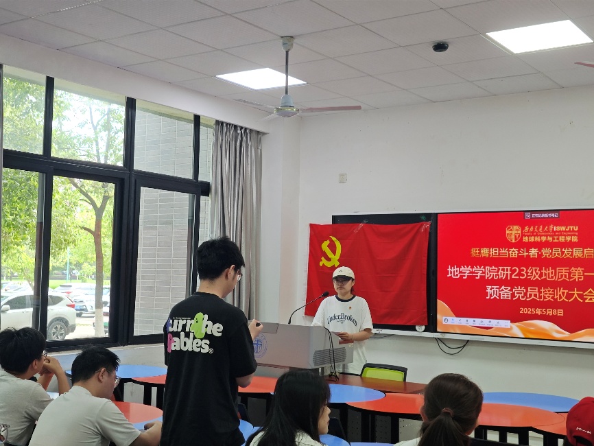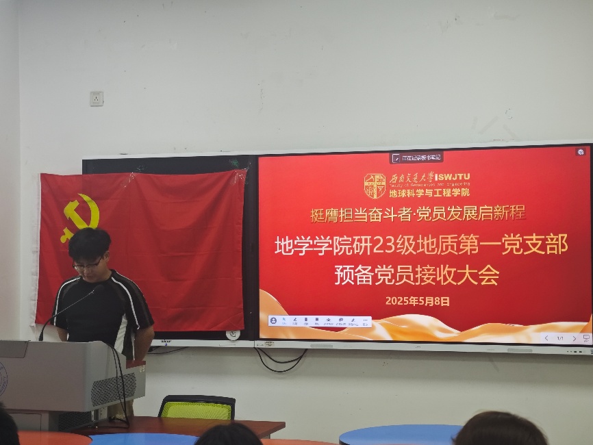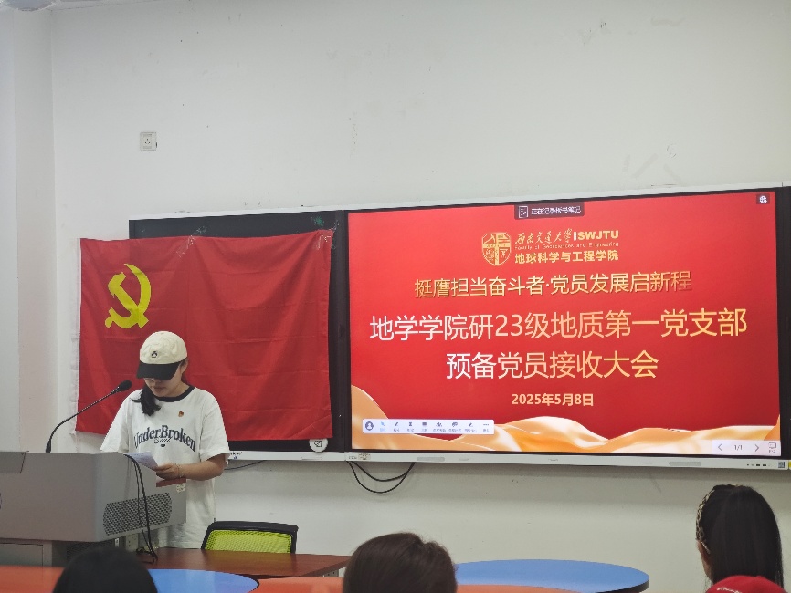 为做好2025年发展党员工作,切实提高党员发展质量。研23级地质第一党支部于2025年5月8日10:00在X4137召开2025-01期预备党员接收大会,本次会议由党支部书记王睿同志主持,学院党委专职组织员李晓宇老师与会参与指导,支部成员总计15人参会。