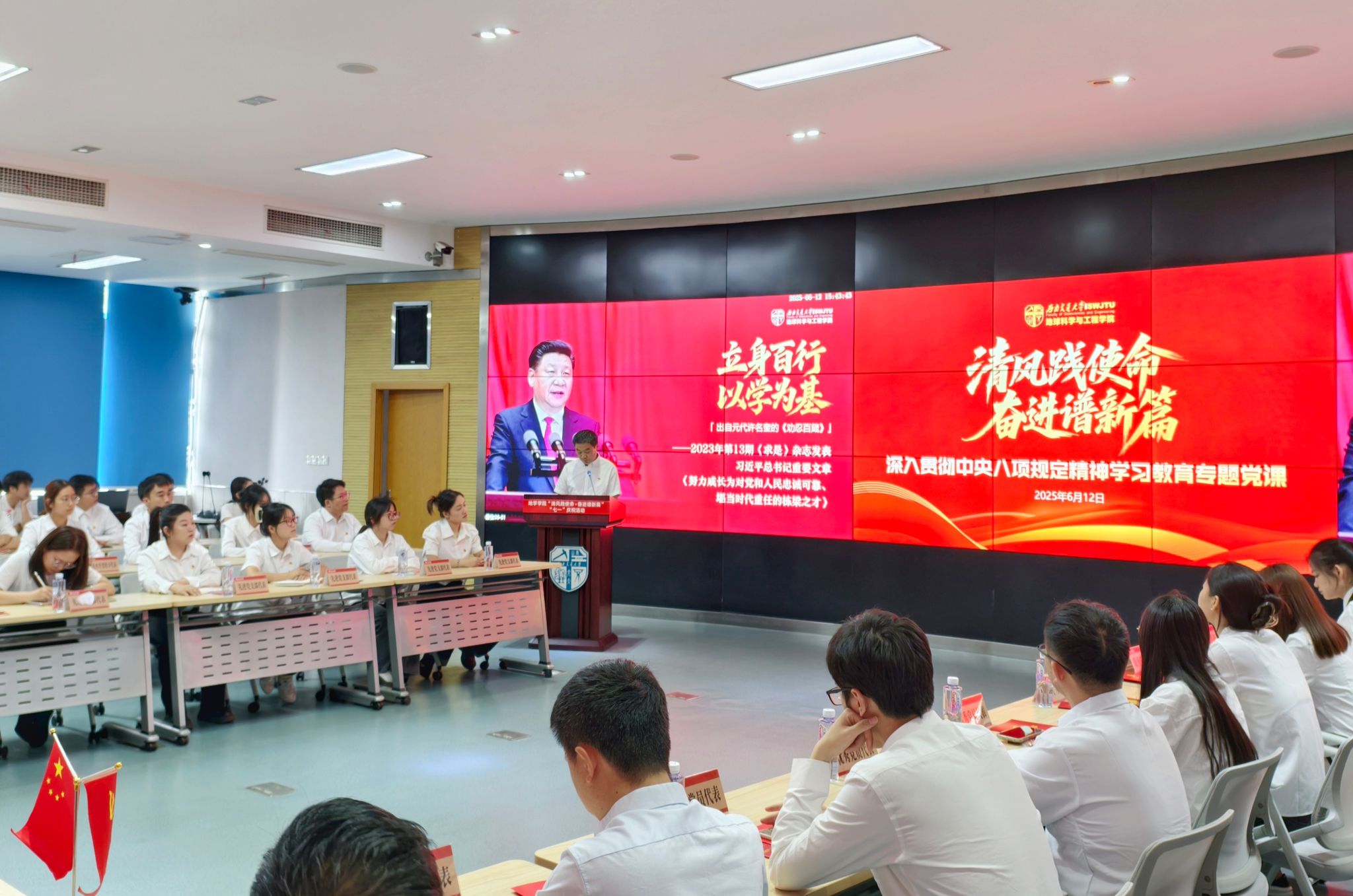 党委于2025年6月12日在X4243会议室开展“清风践使命・奋进谱新篇”——深入贯彻中央八项规定精神学习教育专题党课。党课由党委书记关秦川主讲,党委副书记、纪委书记郑波,党委委员胡卸文出席活动,院内师生党员80余人参加党课。
