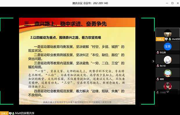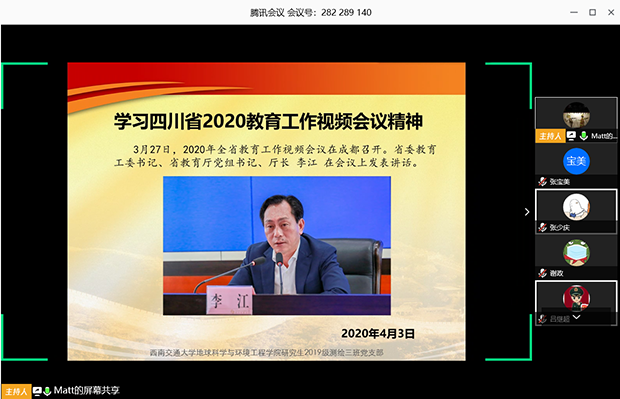 研19级测绘三班党支部在腾讯会议平台召开支部大会,集体学习了省委教育工委书记、省教育厅党组书记、厅长李江和省委教育工委副书记李光华在四川省2020年教育工作视频会议上的讲话。会议由支部书记刘明仁主持,支部4名党员和3名积极分子参加。