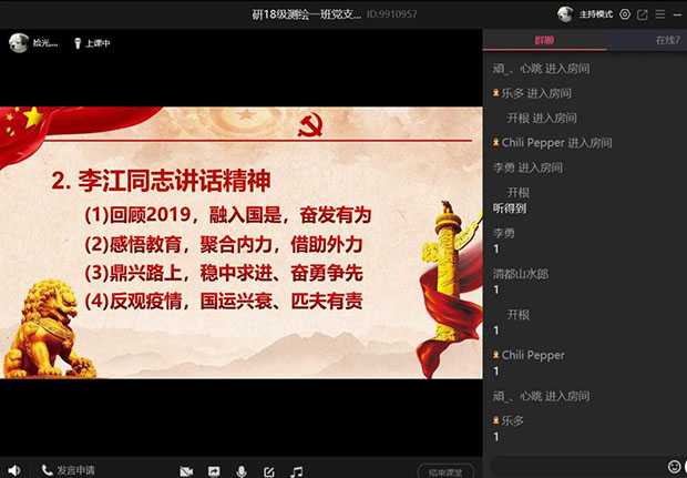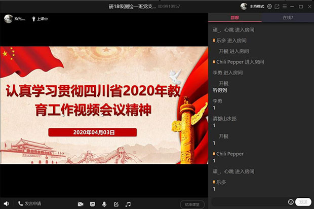 研18级测绘一班党支部学习关于3月27日四川省教育工作视频会议精神。受疫情影响,此次学习于线上进行,以视频会议形式召开,由党支部书记谢奇材同志主持。