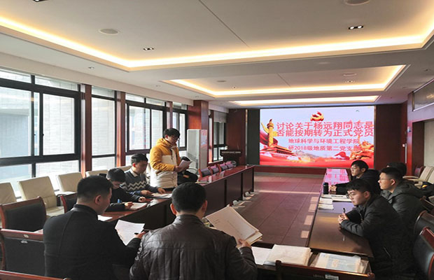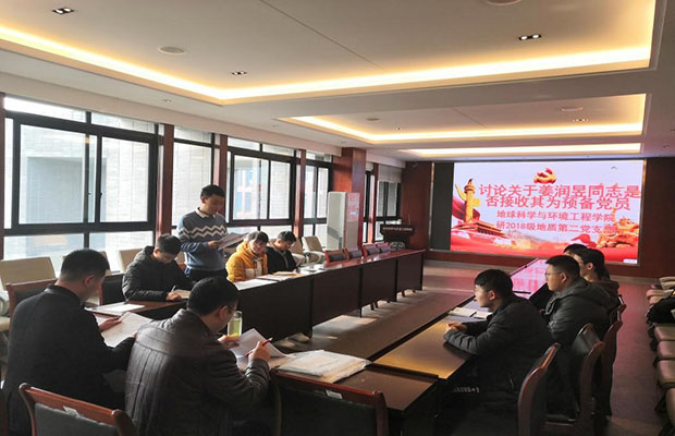 地球科学与环境工程学院研2018级地质第二党支部在四号教学楼X4520召开党支部大会。本次会议的议题是讨论是否接收姜润昱为预备党员和杨远翔同志转正事宜。此次会议由党支部书记周航同志主持,组织员傅尤刚老师莅临指导。