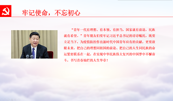 接着,由陈柏吉同志阐述此次微党课的第一个主题:让党旗在防控疫情斗争第一线高高飘扬。陈柏吉同志分为根究着实,力担使命以及同力协契,精诚互助两个方面阐述该主题,讲述了在疫情发生后习近平总书记马上做出指示,要把人民群众的生命安全和身体健康放在首位;全体党员要从自身做起,做好表率,做好疫情防控工作。刘迪一同志阐述本次微党课的第二个主题:让青春在党和人民最需要的地方绽放绚丽之花,刘迪一同志按照时间顺序,回顾往昔先辈的热血青春—五四运动,到今朝党员“90后”甚至“00后”医护人员勇当“逆行者”,奋斗在疫情防控第一线,最后展望未来,祖国新一代的青年应该树立远大理想,勇担历史使命,不忘初心,牢记使命,在实现中华民族伟大复兴的中国梦中不懈奋斗,书写青春灿烂的人生华章。