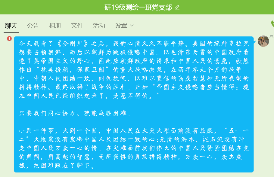 70年前,国人民志愿军将士不畏艰难困苦赢得了抗美援朝战争的伟大胜利。为继承和弘扬伟大抗美援朝精神以及引导学生党员在百年奋斗历程中领悟中国共产党的初心使命,研19级测绘一班党支部在党支部书记杨世恩同志的主持下,于20201123日线上开展“纪念抗美援朝70周年”暨“知党性、跟党走”主题活动。