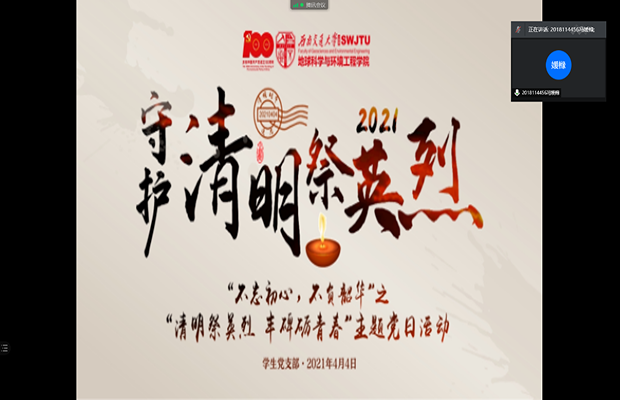 本18级第三党支部于2021年4月6日晚上19:30在线上(腾讯会议ID:465 538 351)开展“不忘初心,不负韶华”之“清明祭英烈 丰碑砺青春”主题党日活动。本次活动由本18级第三党支部组织委员刘民欢主持,本18级第三党支部12名党员参与活动。