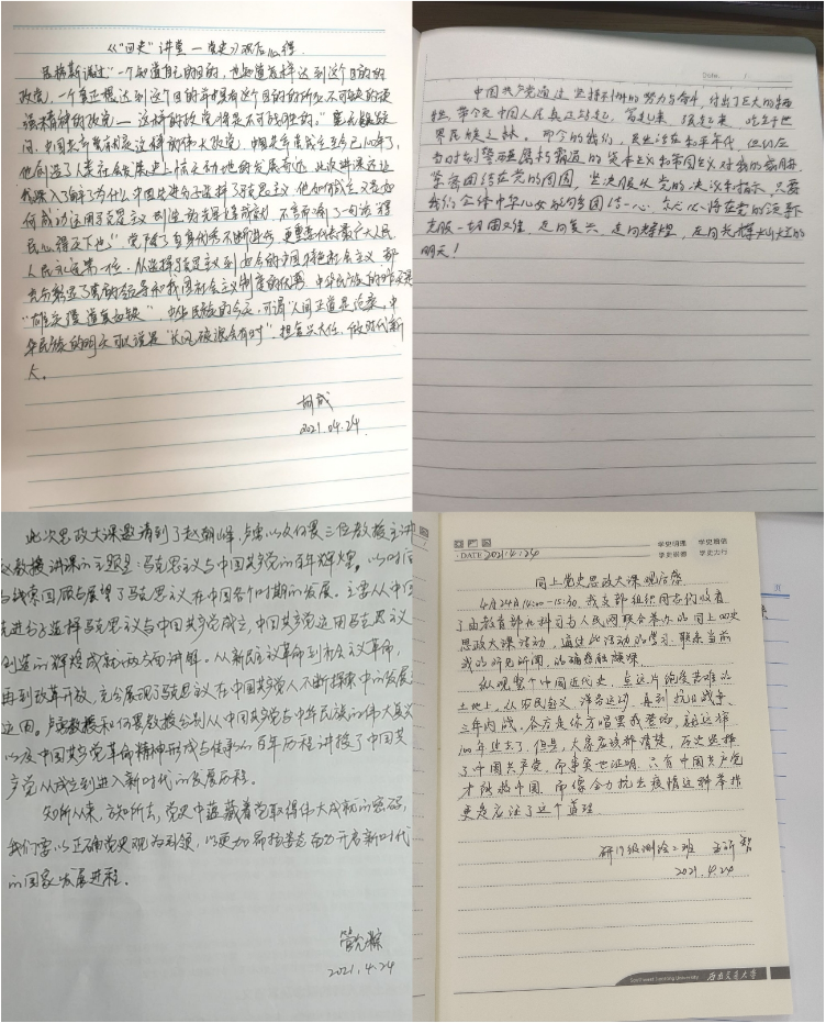 为响应学院要求,深入贯彻落实习近平总书记在党史学习教育动员大会上的重要讲话精神和《中共中央关于在全党开展党史学习教育的通知》的部署安排,4月24日14点,每日大赛 研19级测绘2班党支部组织全体党员、积极分子观看 “同上「四史」思政大课”直播视频,除参与学院集中观看的三名同志外,其余同志均自行观看。观看结束后,同志们在分别手写了对于此次思政大课的学习心得体会。