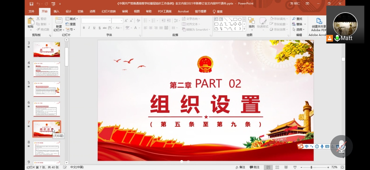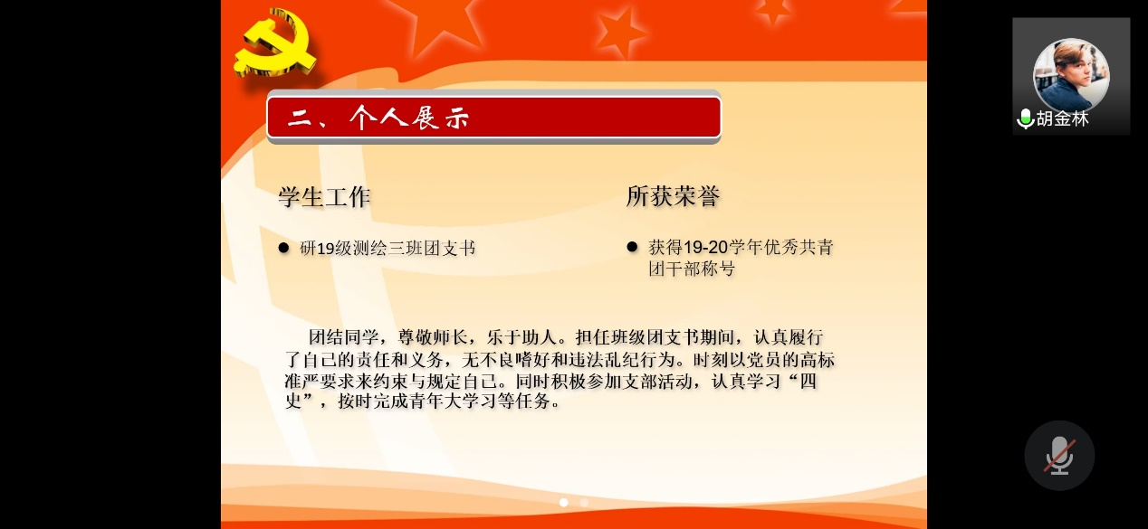 2021年5月6日下午两点,研19级测绘三班党支部在线上召开了支部党员大会。会议主要有两个内容:推优入党答辩大会和学习《中国共产党普通高等学校基层组织工作条例》。会议由支部书记刘明仁主持,支部6名党员和发展对象候选人参加,1名党员请假。