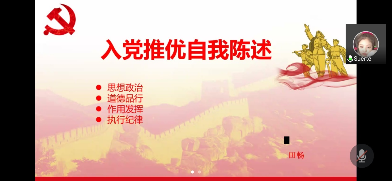 在支部推优入党答辩大会上,党员发展对象候选人田畅和胡金林从思想政治、道德品行、作用发挥和执行纪律四个方面做了自我陈述,并阐述了入党动机和积极分子期间的学习体会。两名同学思想上积极进步,能认真学习党的指导思想和路线、方针、政策。积极向党组织靠拢,完成支部交予的任务,积极参加支部活动,按时观看青年大学习主题团课。两名同学热爱集体,团结同学,乐于助人,愿意奉献。田畅同学担任班长,能认真负责做好班级各项基本事务、组织班级学习活动和举办班级交流活动。胡金林同学担任团支部书记,能认真负责做好团支部事务和督促大家完成青年大学习。经支部党员集体讨论、表决,同意将田畅和胡金林两名同学列为党员发展对象进行考察培养。