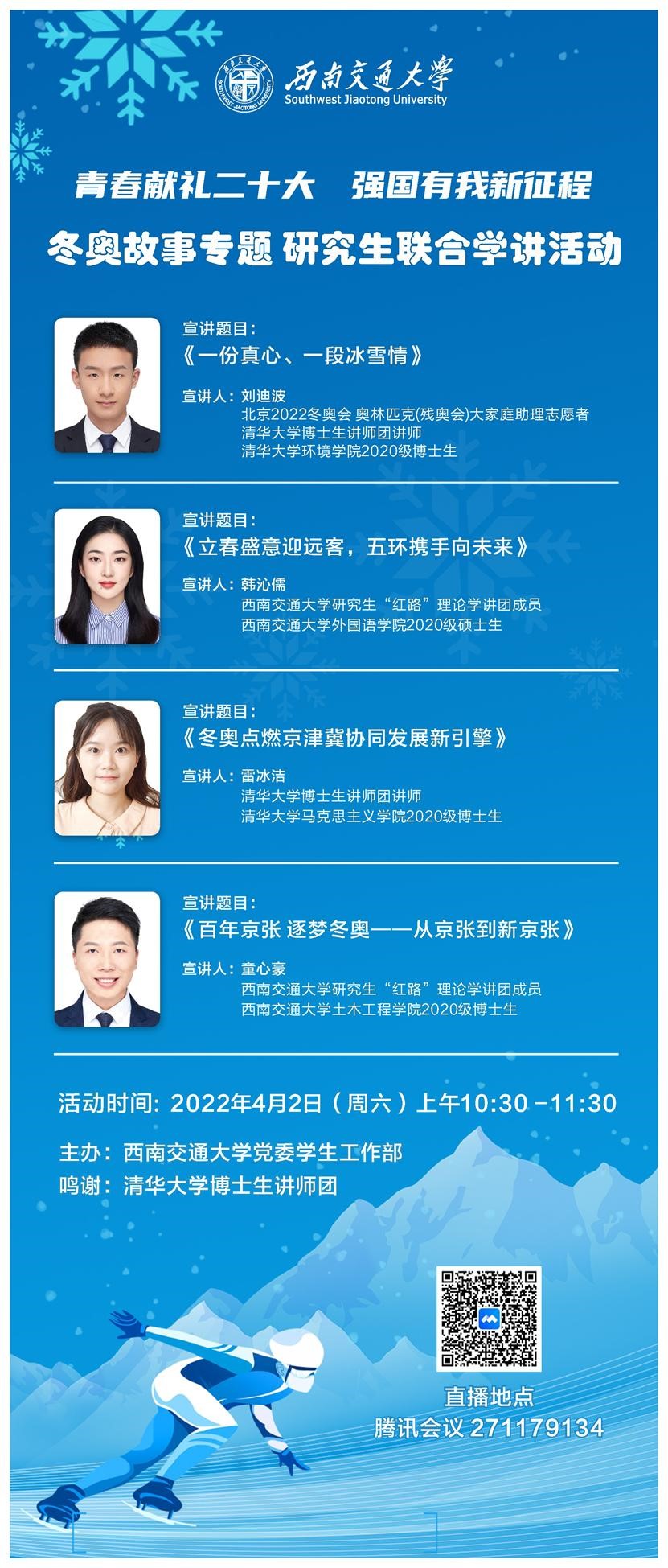 宣讲人:刘迪波,北京2022冬奥会 奥林匹克(残奥会)大家庭助理志愿者,清华大学博士生讲师团讲师,清华大学环境学院2020级博士生。