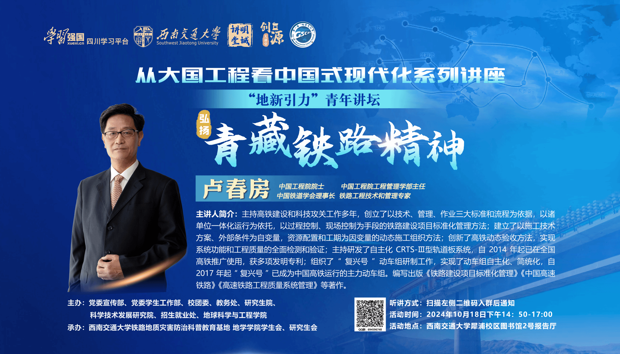 在“学习强国”四川学习平台、党委学生工作部、校团委、党委宣传部、教务处、研究生院、科学技术发展研究院以及招生就业处的支持下,邀请了大国工程一线以及思想政治教育与人文社科领域的专家、学者、教授为主讲嘉宾,通过“地新引力”青年讲坛的方式,为青年学生解惑授业、增知识、长才干,号召广大学生立志做有理想、敢担当、能吃苦、肯奋斗的新时代好青年。“地新引力”青年讲坛——“从大国工程看中国式现代化”青藏铁路精神专题讲座将于2024年10月18日举行,现就相关通知如下: