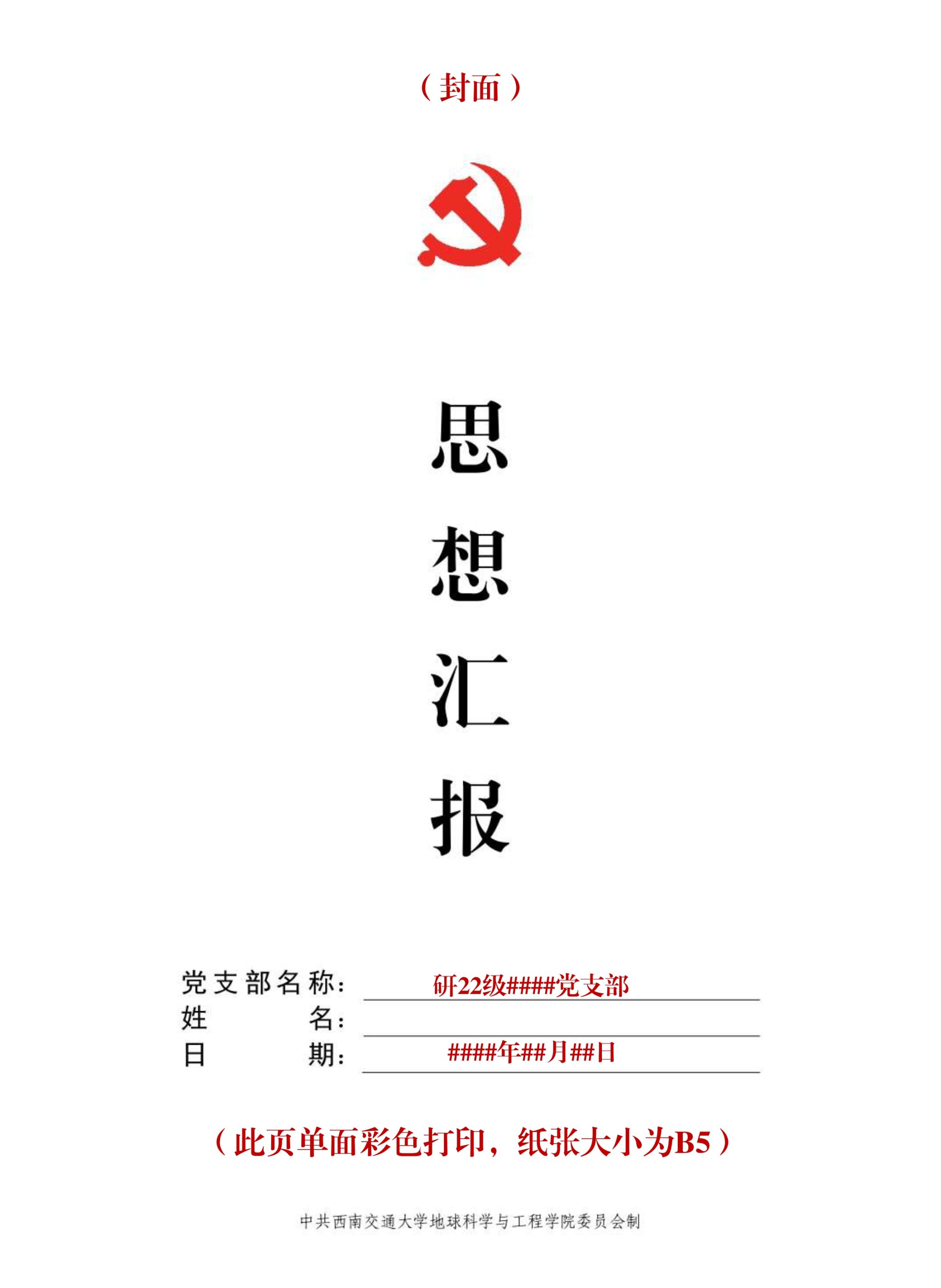 思想汇报封面原件见附件,B5单面彩色打印。
