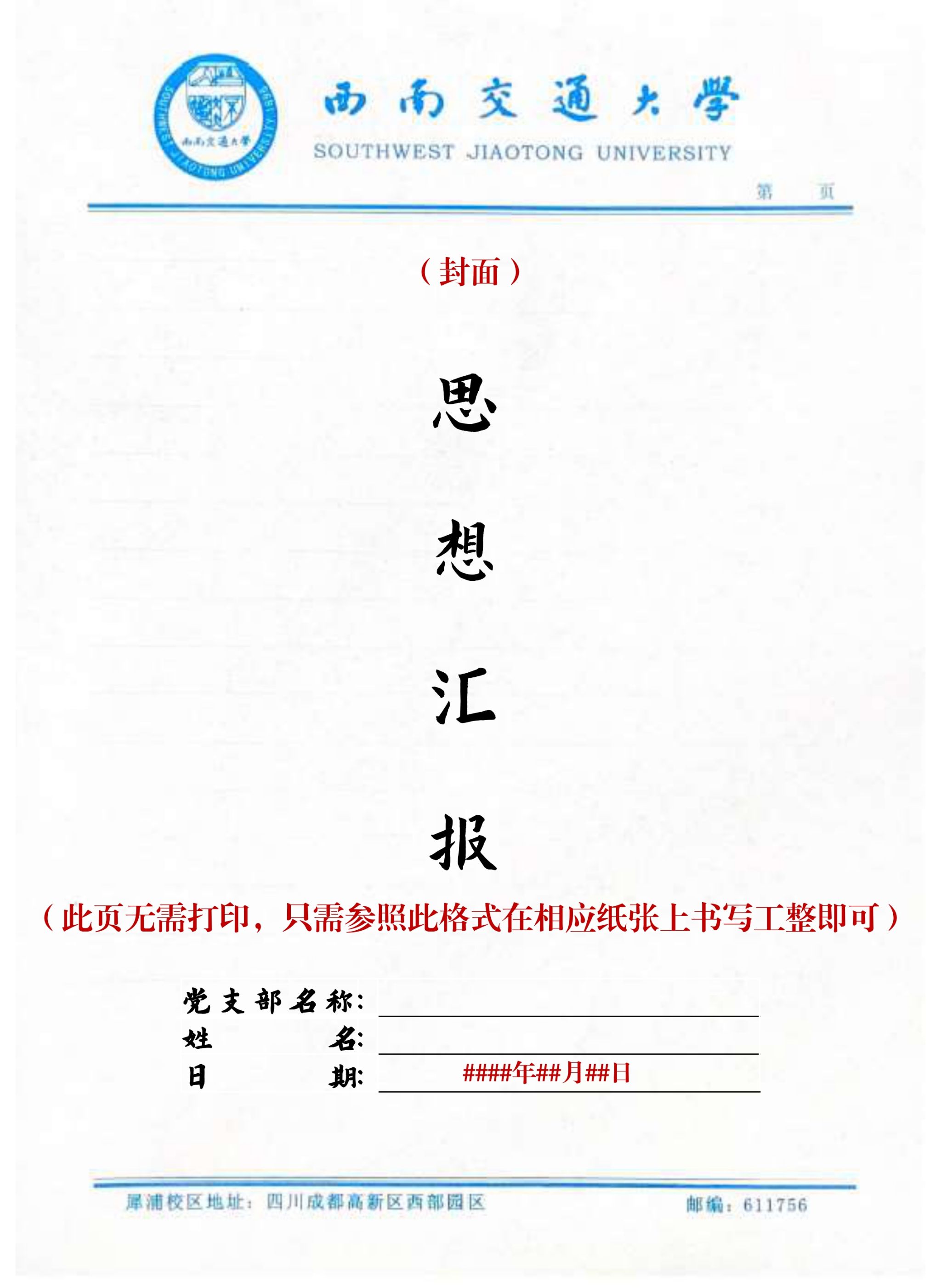 思想汇报封面样例及书写要求