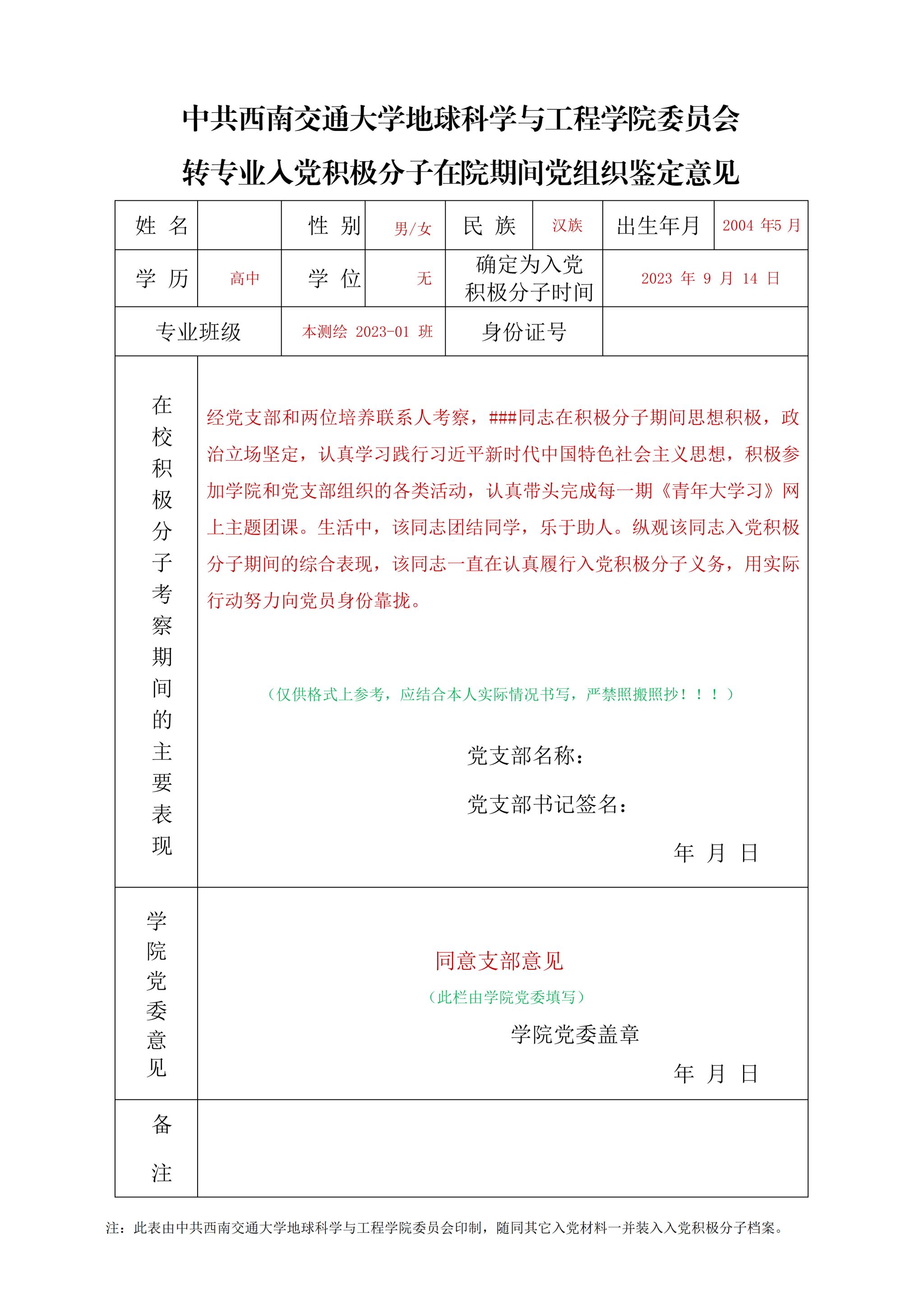 2)转专业入党积极分子在院期间党组织鉴定意见样例与撰写指南:
