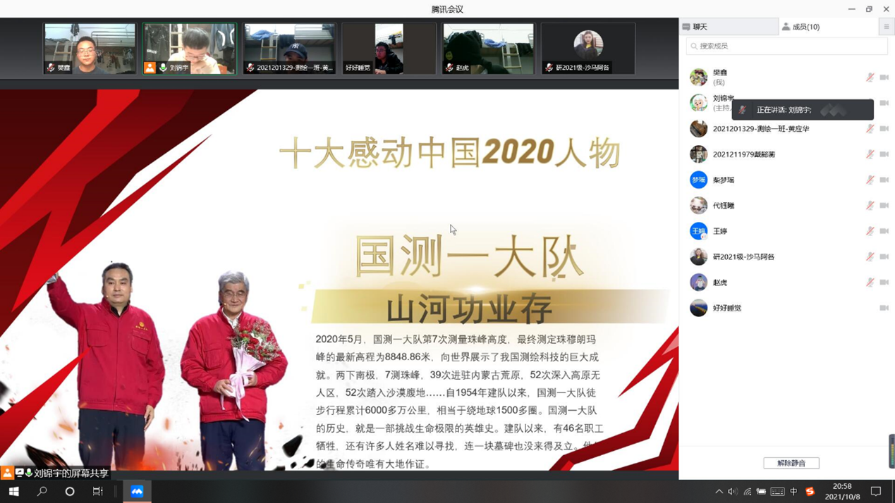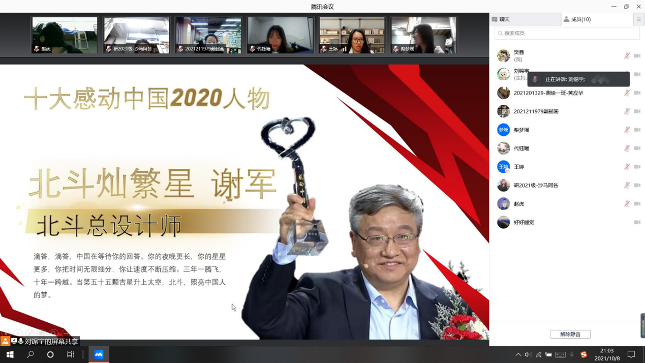 2020年测绘行业的两个代表登上了《感动中国》的舞台,刘锦宇同学号召全体成员学习国测一大队与北斗总设计师谢军身上的爱党爱国精神。