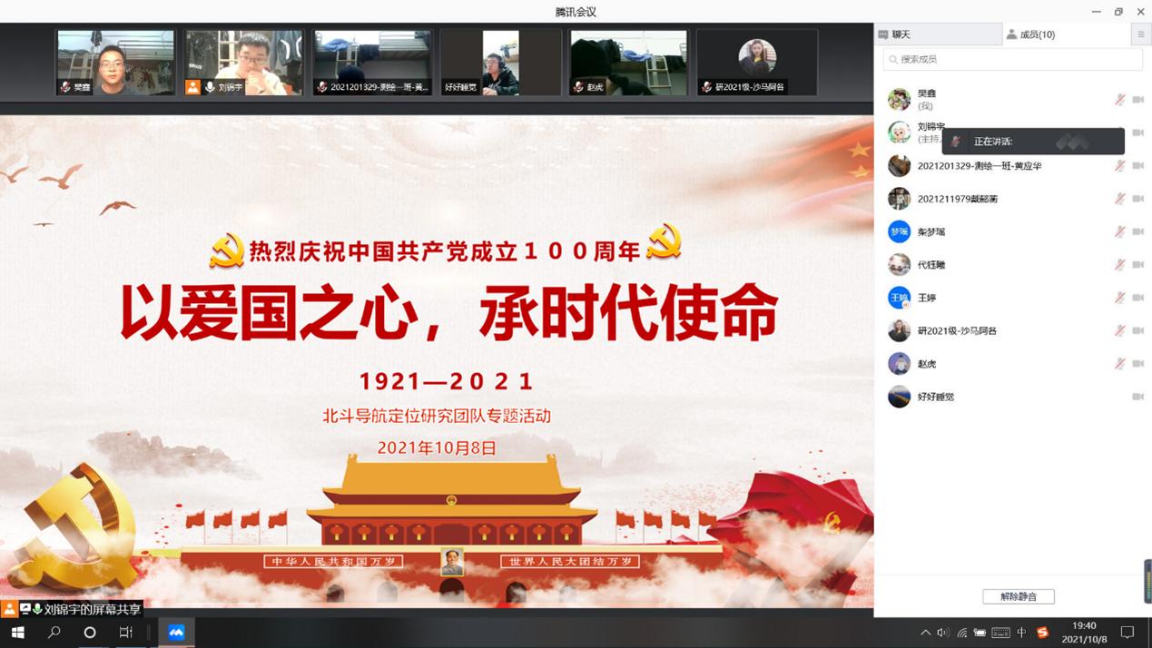 10月8日晚,北斗导航定位研究团队举办了“以爱国之心,承时代使命” 为主题的爱国情怀和思想政治建设活动。本次活动由队长刘锦宇主持。