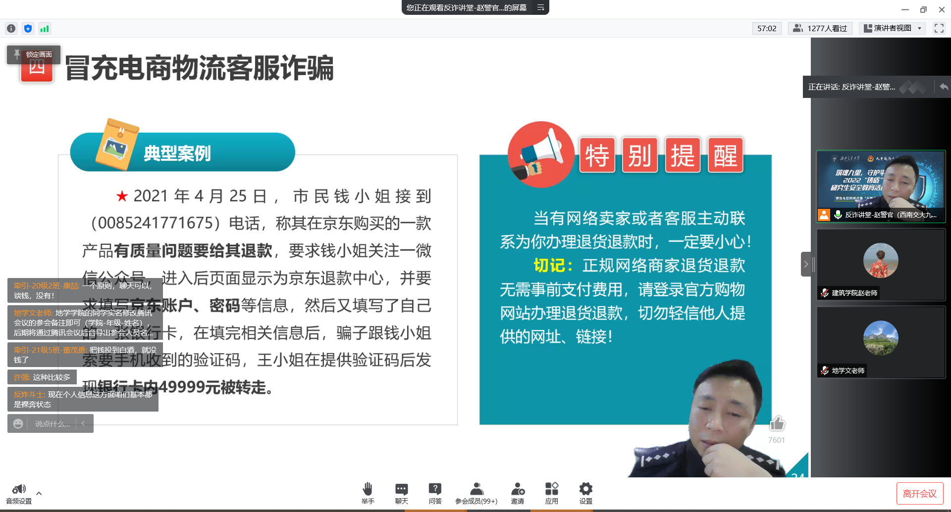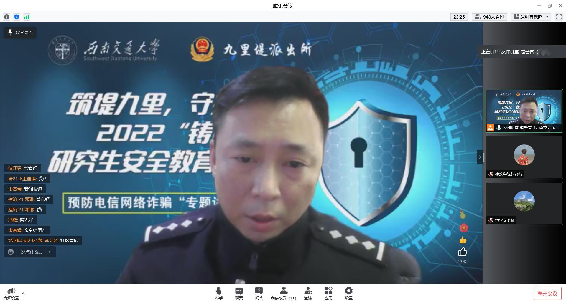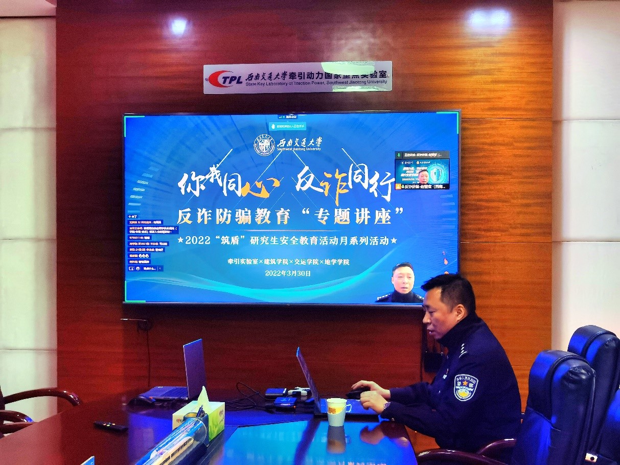 联合牵引动力实验室、建筑学院、交运学院共同举办了“你我同心 反诈同行”——反诈防骗教育“专题讲座”。根据疫情防控需要,本次讲座通过腾讯会议线上召开,特邀九里堤派出所赵磊警官担任主讲人,每日大赛
