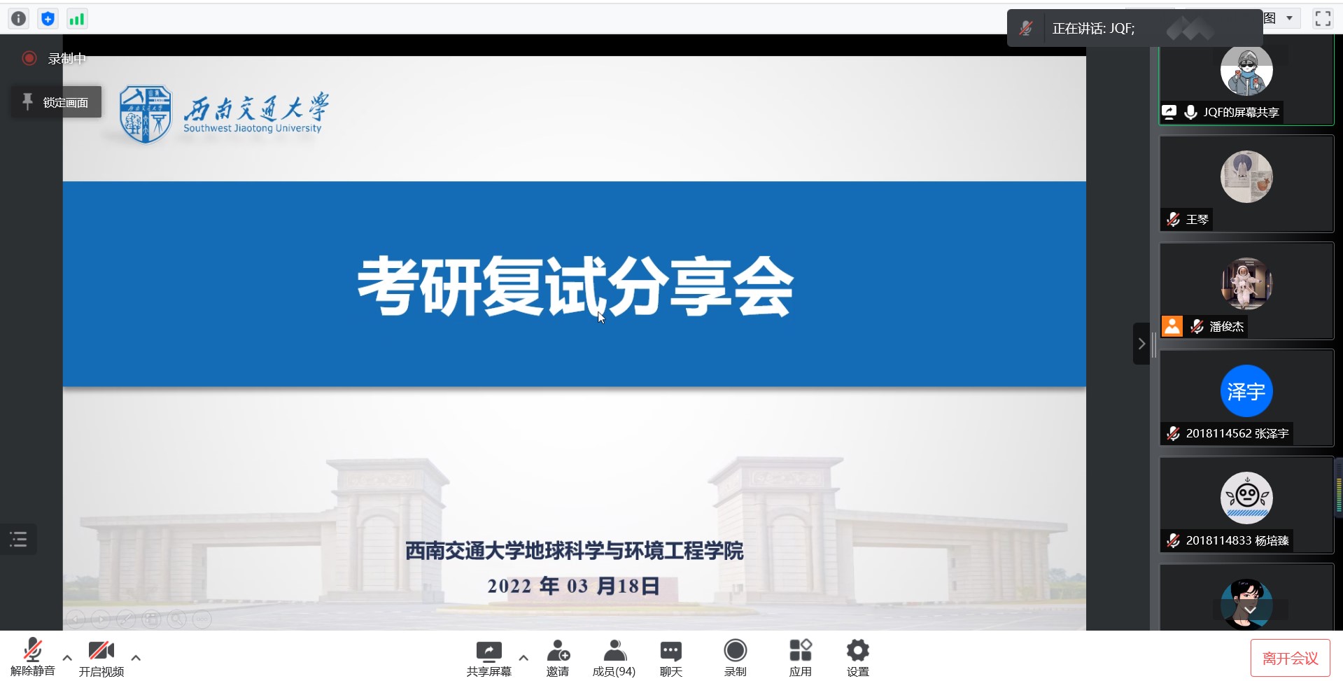 研究生会于2022年3月18日在腾讯会议成功举行了考研复试经验分享会,本次分享会面向2022届预报考我院研究生的同学,旨帮助同学建立复试信心,进而促进我院复试工作的顺利进行,本次复试经验分享会邀请到了2021级测绘、地质、资环三个专业的复试优秀代表,为2022届预报名我院研究生的同学分享他们在考研复试过程中的心得体会。