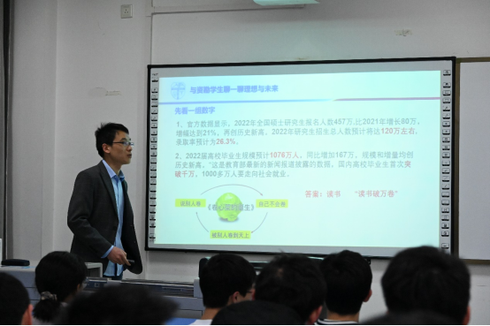 资源勘查工程专业的发展史和资勘是什么进行了详细的介绍,并展示了一组考研数据,指出如今考研形势严峻,提醒同学们要早做打算。在提问大家的考研初心是什么时,20级资勘班长刘熙塘同学回答到,他希望能通过读研进一步增加自己的知识储备。裴老师也表示,希望同学们能通过考研摆脱迷茫处境,养成良好的学习习惯,为自己的未来创造更多可能性,成为更好的自己;此外,裴老师还分享了历届资勘学长学姐的毕业去向表,并就考研科目、可考专业,院校选择给出了详细的建议和指导,并以陶渊明的一首《杂诗》寄语同学们能“及时当勉励,岁月不待人”。会议进入到尾声,17级资勘吕国森学长简短介绍了自己的学习经历,主要从保研、就业、考研三个方向分享了自己的心得体会和经验方法,并以“虽然未来藏在迷雾里,叫人看来胆怯,但当你踏足其中,就会云开雾散”结语。